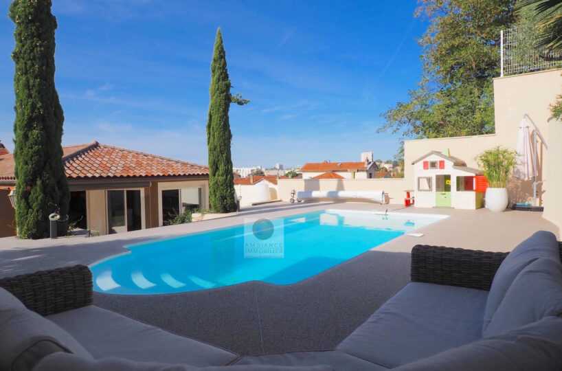VALENCE, en exclusivité, dans quartier recherché, le calme, la luminosité, une conception atypique et de beaux volumes pour cette maison d’architecte de 221m2. Salon-séjour, cuisine intégrée de 70m2 avec de grandes baies vitrées offrant une belle perspective sur les terrasses et le jardin paysager, buanderie, 5 chambres dont 1 suite parentale de 33m2 avec dressing, salle de bains avec baignoire et vasque et 1 suite enfant de 20m2 avec dressing, salle d’eau avec douche et vasque, 1 salle d’eau, un espace bureau/salle de jeux. Chauffage par pompe à chaleur : plancher chauffant/rafraîchissant + climatisation dans la pièce de vie, huisseries en alu et pvc, volets électriques. Garage de 41m2 avec 2 portails motorisés, 1 cour fermée avec parking 1 VL. Un bel espace détente autour d’une piscine de 6m x 3,5m et un pool-house de 25m2 avec sanitaires. Construction de 2011 sur une parcelle de 503m2. DPE : B 81 – GES : A 3