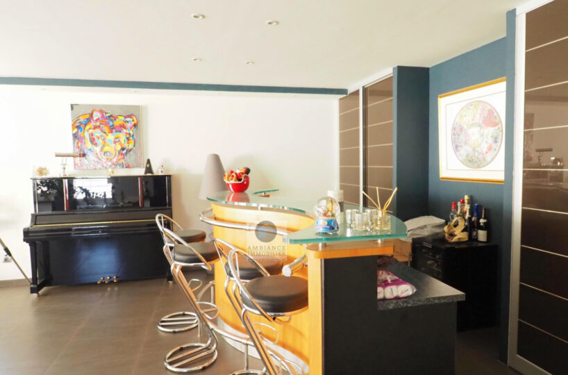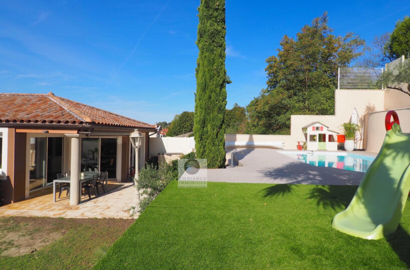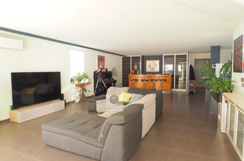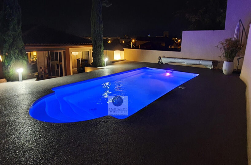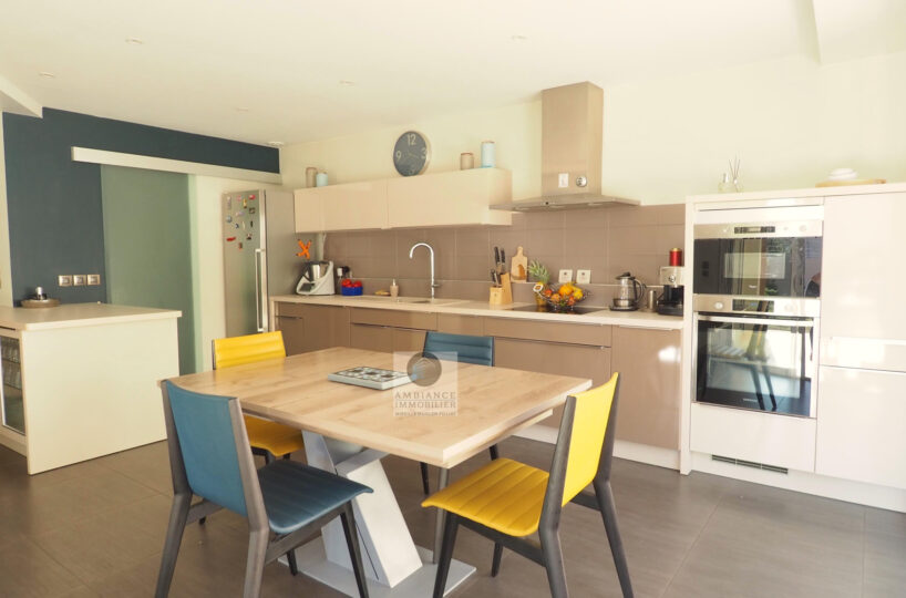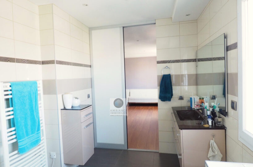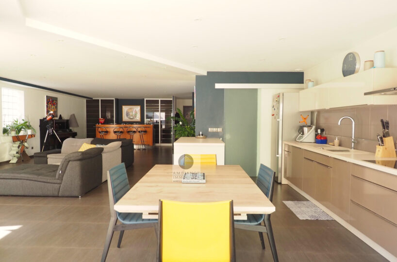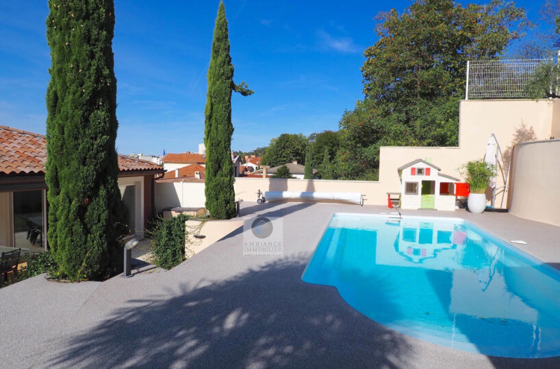 VALENCE, en exclusivité, dans quartier recherché, le calme, la luminosité, une conception atypique et de beaux volumes pour cette maison d’architecte de 221m2. Salon-séjour, cuisine intégrée de 70m2 avec de grandes baies vitrées offrant une belle perspective sur les terrasses et le jardin paysager, buanderie, 5 chambres dont 1 suite parentale de 33m2 avec dressing, salle de bains avec baignoire et vasque et 1 suite enfant de 20m2 avec dressing, salle d’eau avec douche et vasque, 1 salle d’eau, un espace bureau/salle de jeux. Chauffage par pompe à chaleur : plancher chauffant/rafraîchissant + climatisation dans la pièce de vie, huisseries en alu et pvc, volets électriques. Garage de 41m2 avec 2 portails motorisés, 1 cour fermée avec parking 1 VL. Un bel espace détente autour d’une piscine de 6m x 3,5m et un pool-house de 25m2 avec sanitaires. Construction de 2011 sur une parcelle de 503m2. DPE : B 81 – GES : A 3