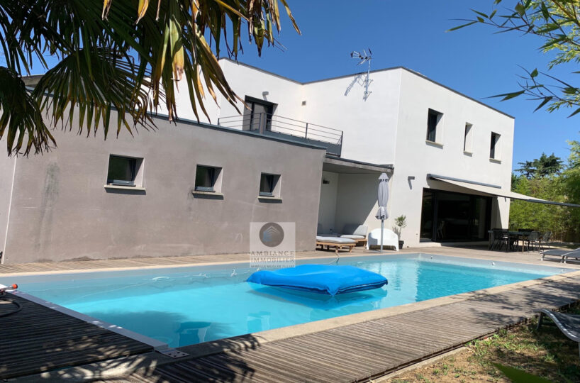 VALENCE dans quartier résidentiel, la luminosité, de beaux volumes, une conception agréable, un esprit contemporain et épuré pour cette maison d’architecte de 2010 de 137m2. Une pièce de vie de 52m2 : salon-séjour, cuisine intégrée Schmidt, une immense baie vitrée offrant une belle perspective sur le jardin, buanderie. Au 1er étage : 4 chambres dont 1 suite parentale de 20m2 ouvrant sur 1 terrasse, salle d’eau avec douche à l’italienne et vasque, dressing,1 salle de bains avec baignoire et vasque. Chauffage par pompe à chaleur : plancher chauffant/rafraîchissant, huisseries en alu, volets électriques. Alarme. Garage – parkings. Parcelle de 602m2 avec jardin paysager, une belle terrasse avec store motorisé, jeu de boules, piscine 11m x 3,60m sécurisée par volet immergé.