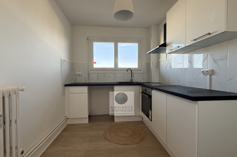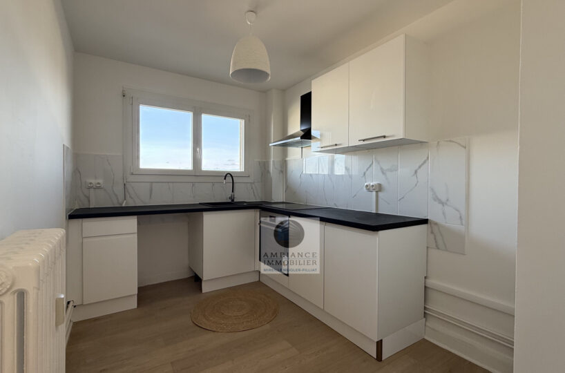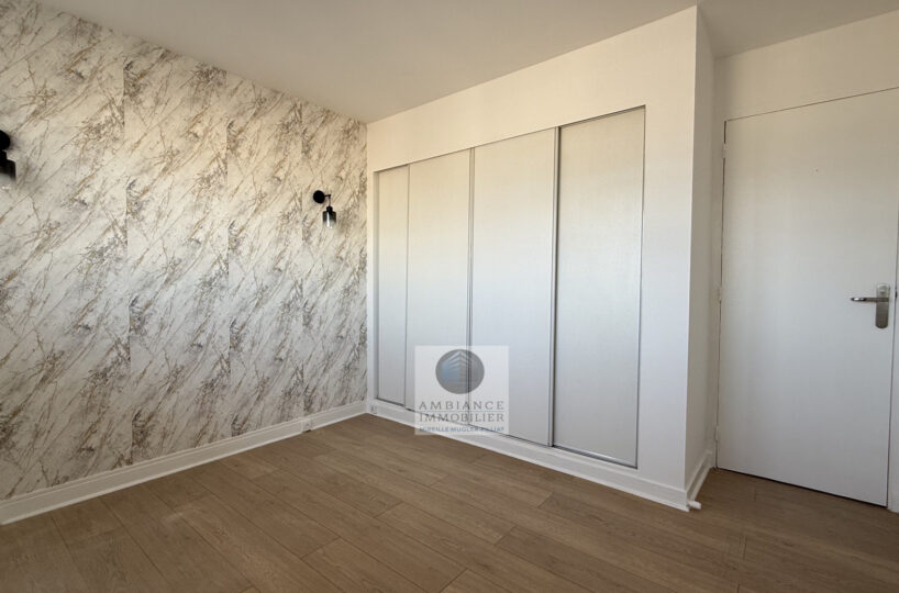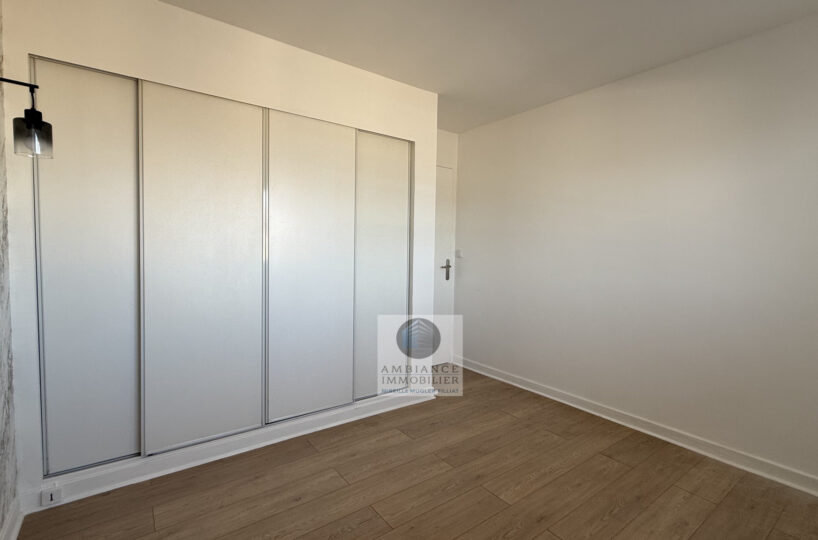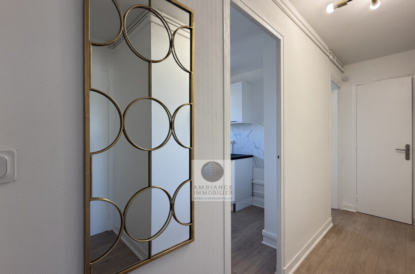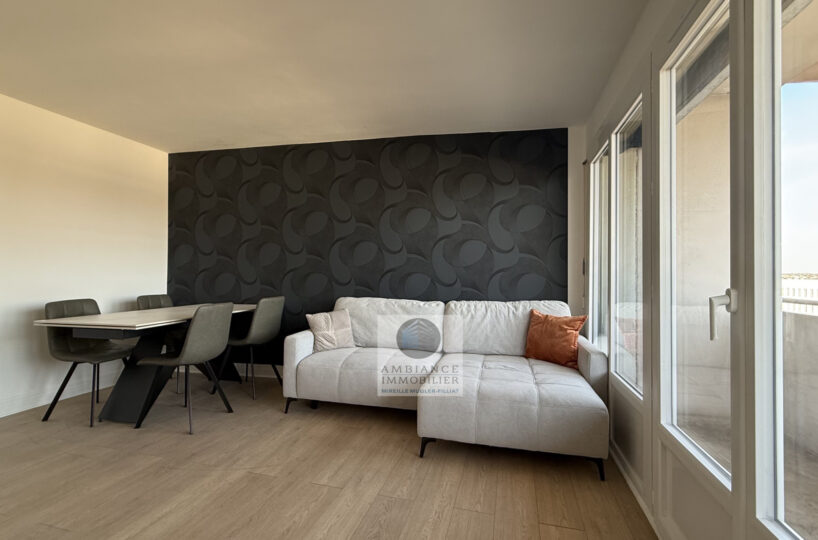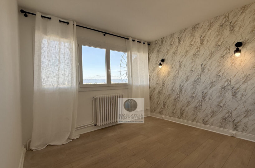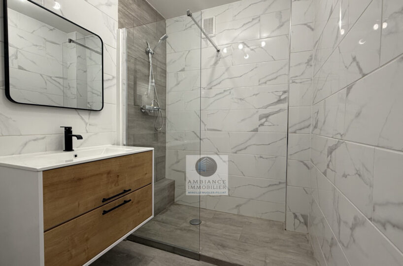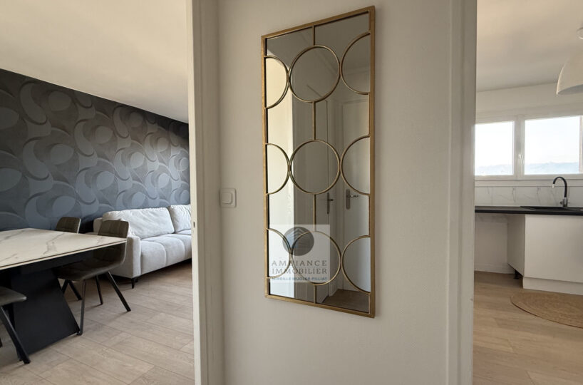 Un séjour-salon avec de grandes baies vitrées offrant une belle perspective sur le Vercors et l’accès au balcon, cuisine aménagée, une chambre avec tout un pan de mur en placards, salle d’eau avec vasque et douche à l’italienne.