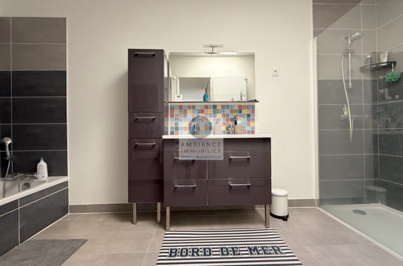 Un espace nuit avec 4 chambres, une salle de bains de 9m2 avec vasque, baignoire et douche à l’italienne.