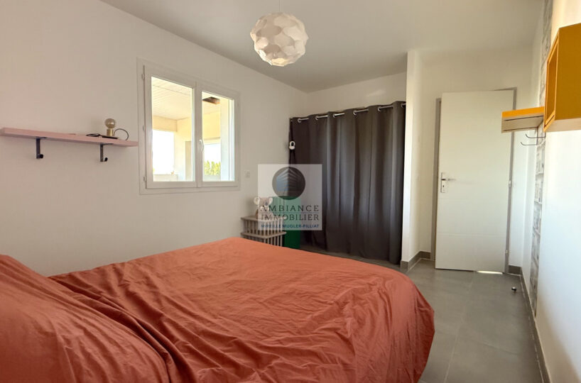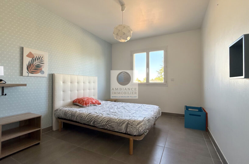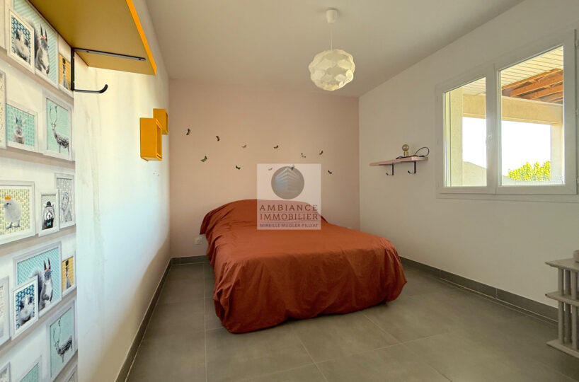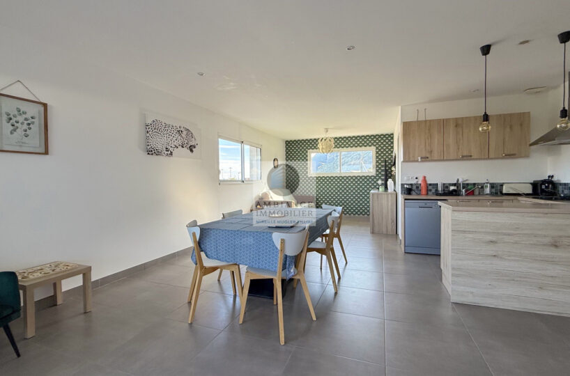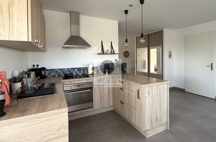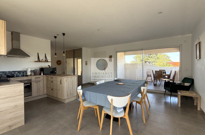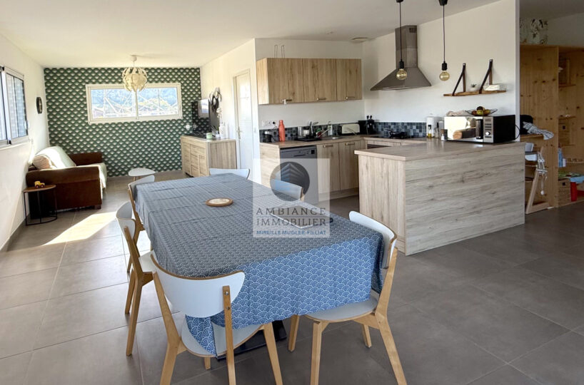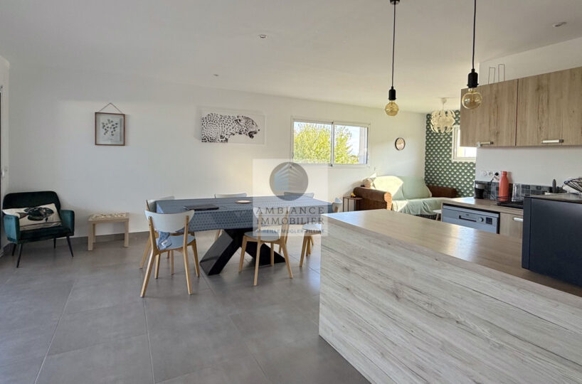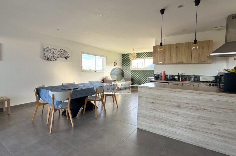 Une pièce de vie de 37m2 : cuisine intégrée ouverte sur un séjour-salon et une grande baie vitrée pour accéder à la terrasse couverte, cellier/buanderie.
