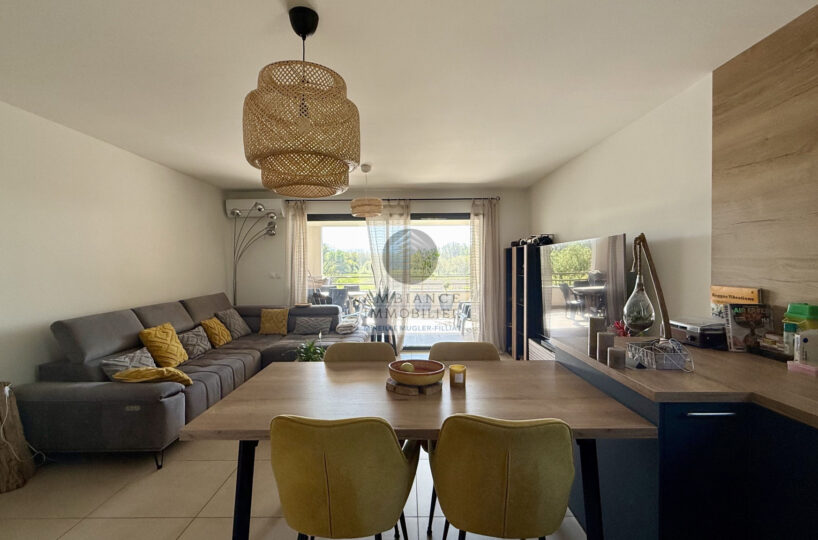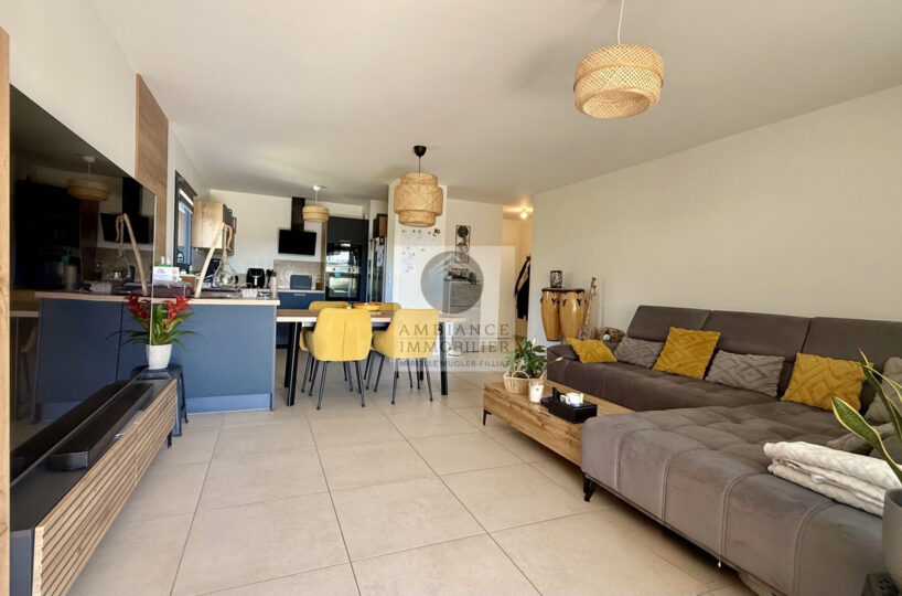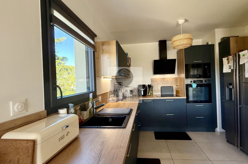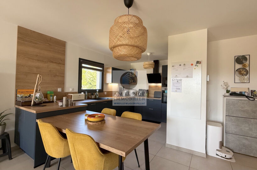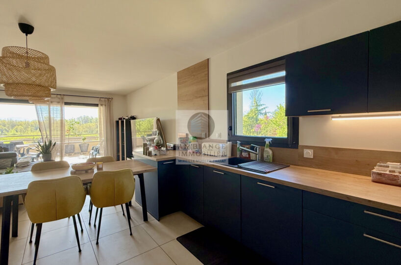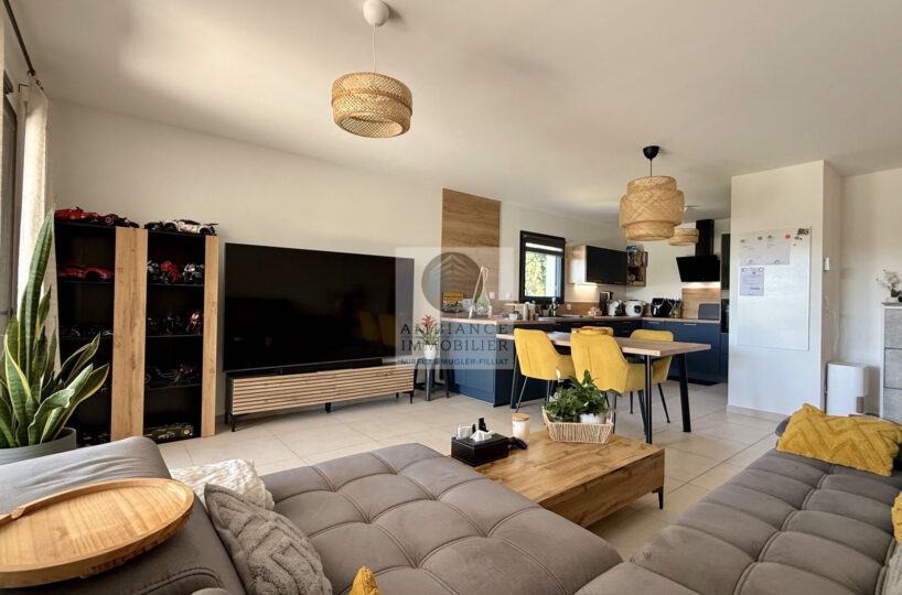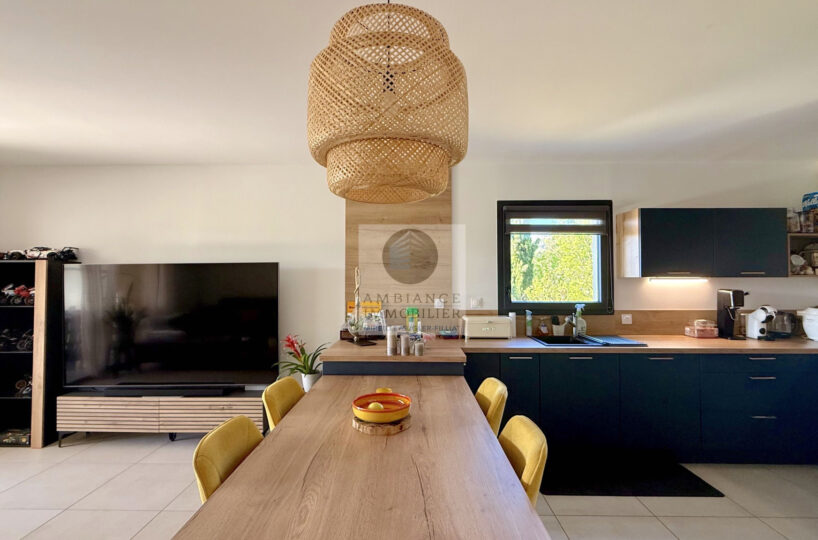 Une pièce de vie de 34m2 : cuisine dînatoire joliment intégrée ouverte sur le salon et une grande baie vitrée pour accéder à la terrasse couverte, véritable prolongement de l’espace de vie.