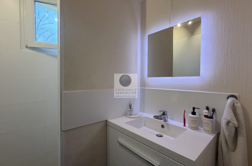 Un salon avec balcon au sud, cuisine intégrée avec balcon, 2 chambres avec placards, salle d’eau avec vasque et douche à l’italienne.