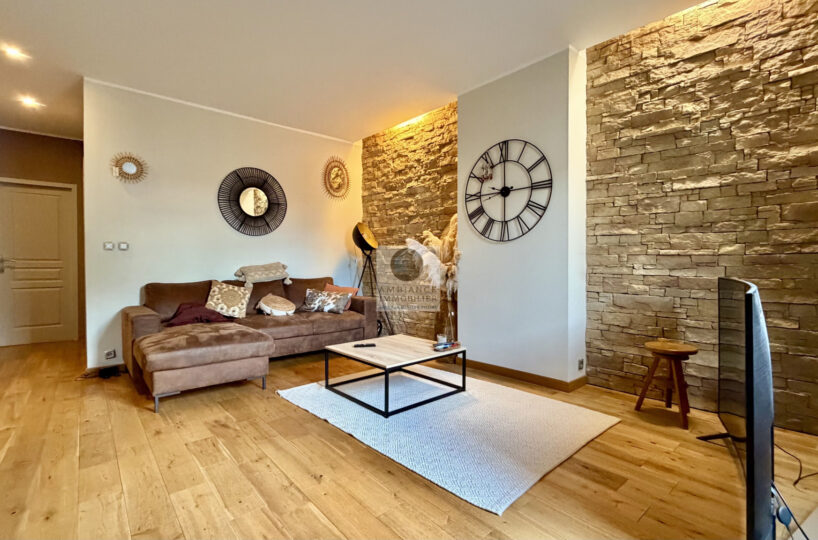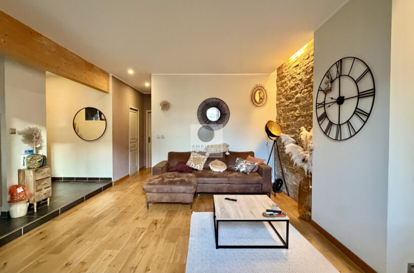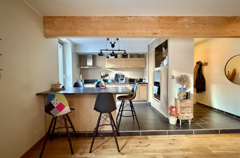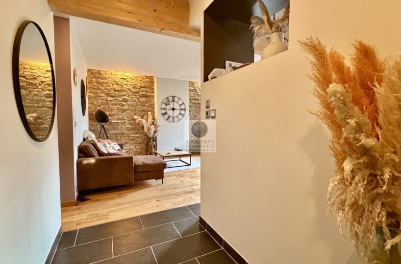 Une entrée offrant une belle perspective sur une superbe pièce de vie de 30m2 avec de beaux parquets et un pan de mur en parement de pierres : une cuisine intégrée avec un ilot dînatoire ouverte sur le salon.