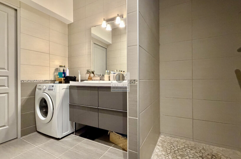 Une salle d’eau avec grande vasque et douche à l’italienne.