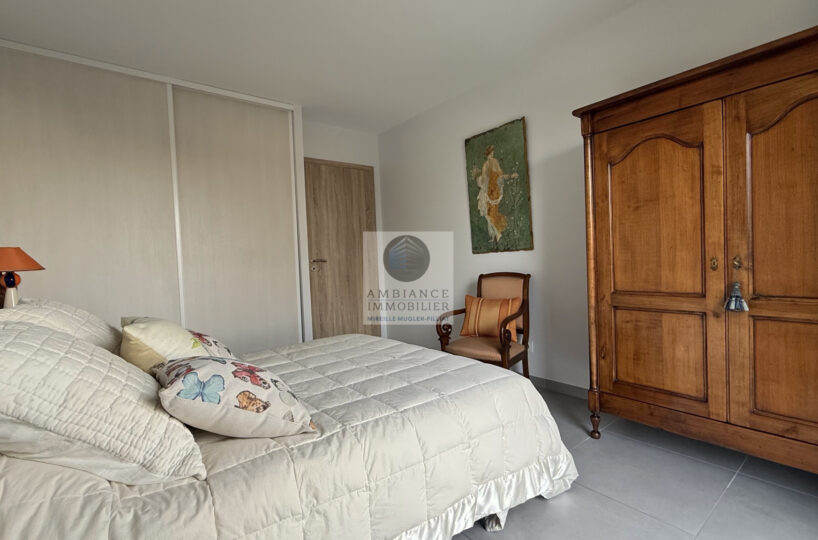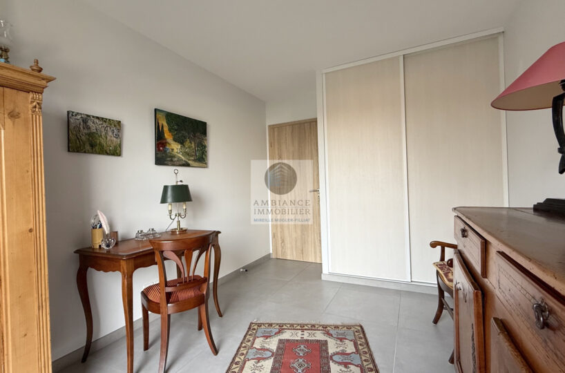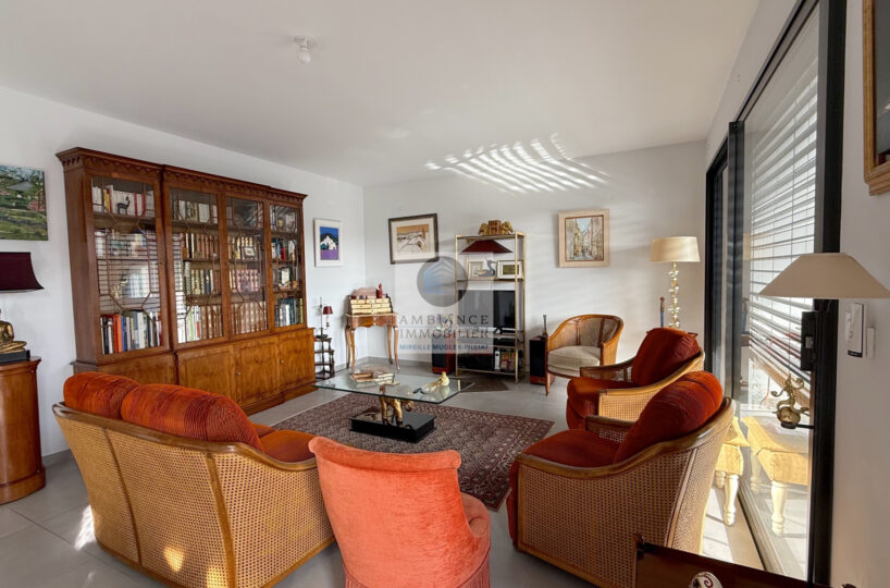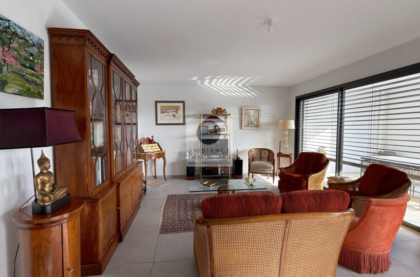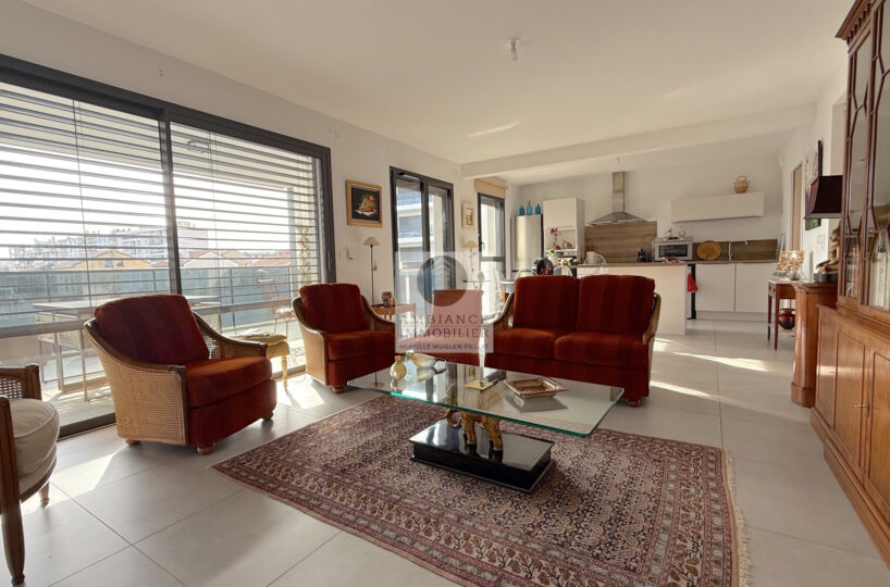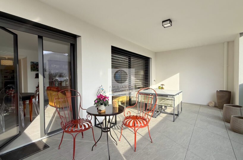 Une belle pièce de vie de 35m2 : séjour-salon avec cuisine intégrée et de grandes baies vitrées avec accès à une terrasse couverte de 20m2 exposée au Sud, un cellier/buanderie.