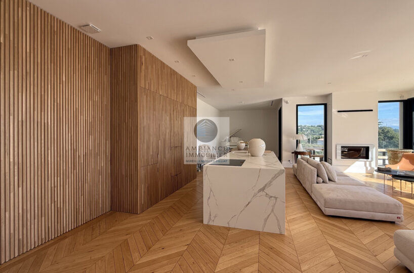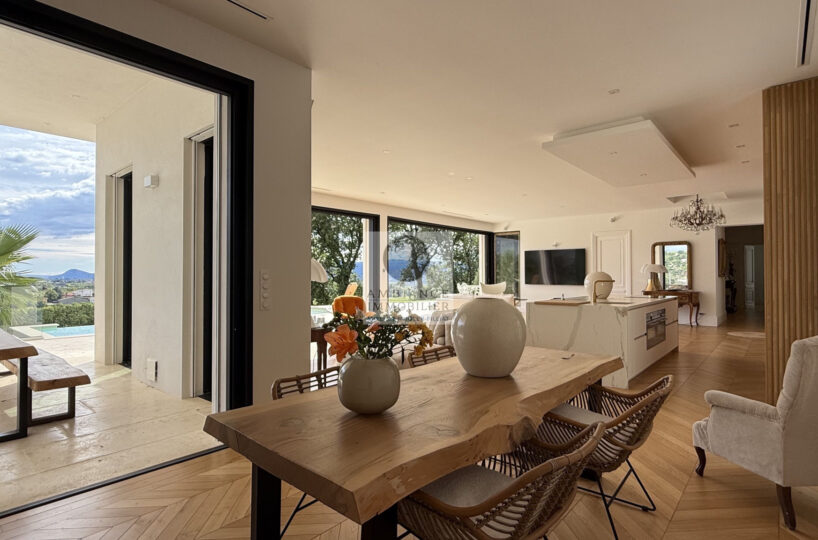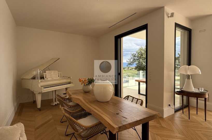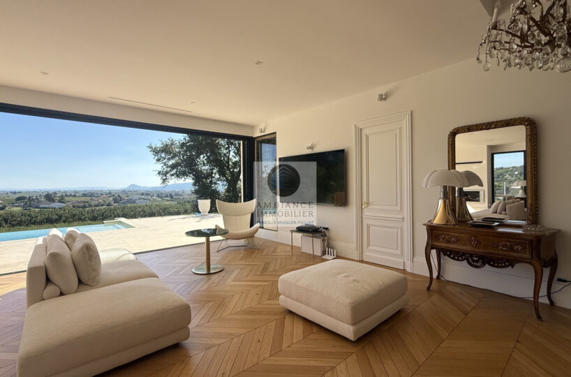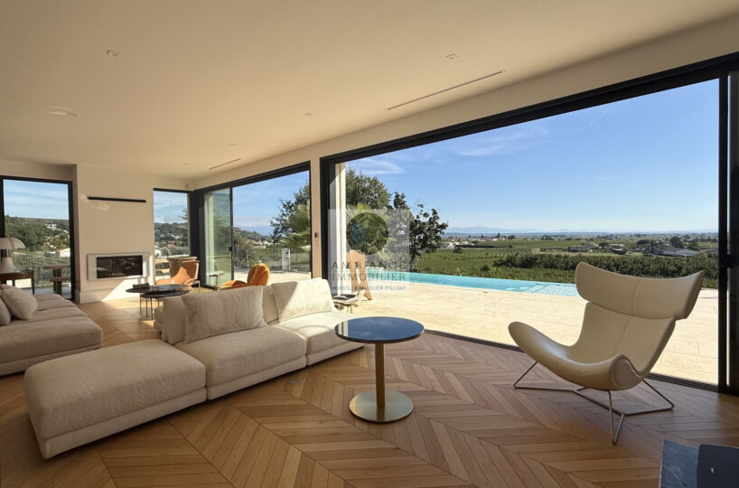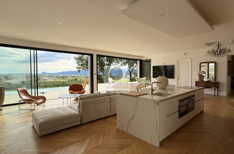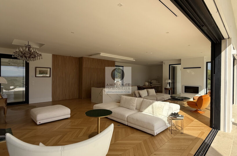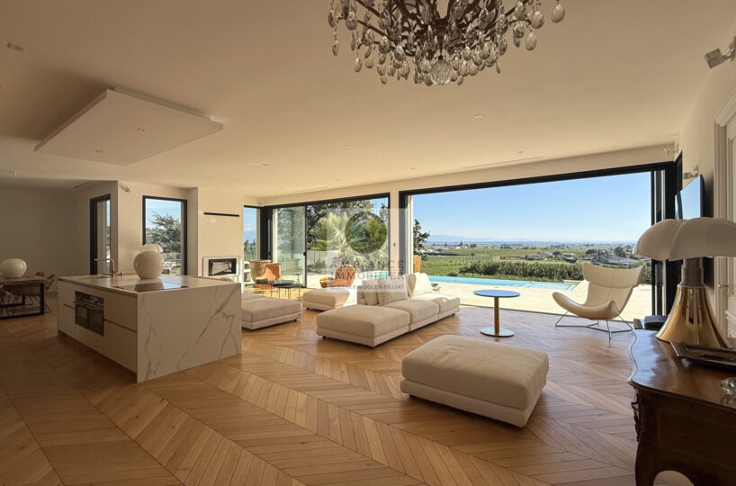 Une magnifique pièce de vie de 98m2 baignée de lumière avec toute une façade en baies vitrées, la frontière effacée entre l’intérieur et l’extérieur pour profiter pleinement des différentes terrasses et de la piscine.