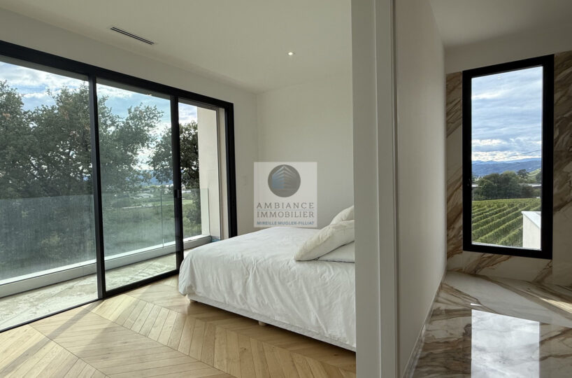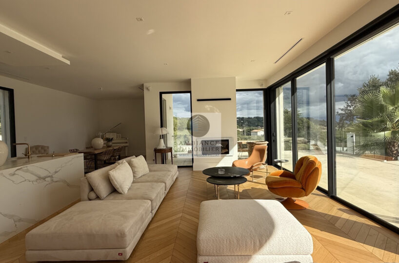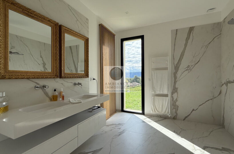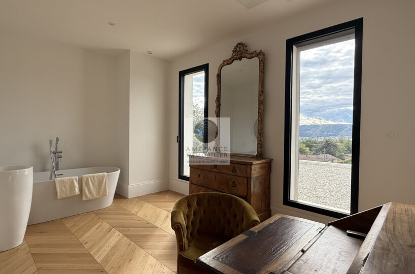 Chauffage et climatisation par pompe à chaleur en gainable et plancher chauffant – huisseries en alu – baies à galandages, volets BSO – domotique – alarme.