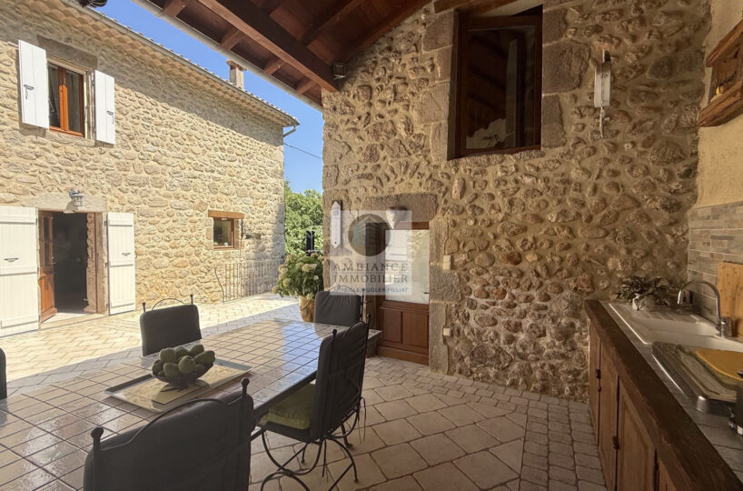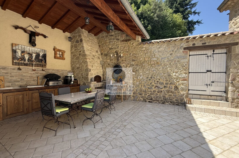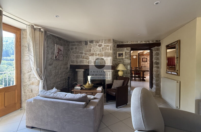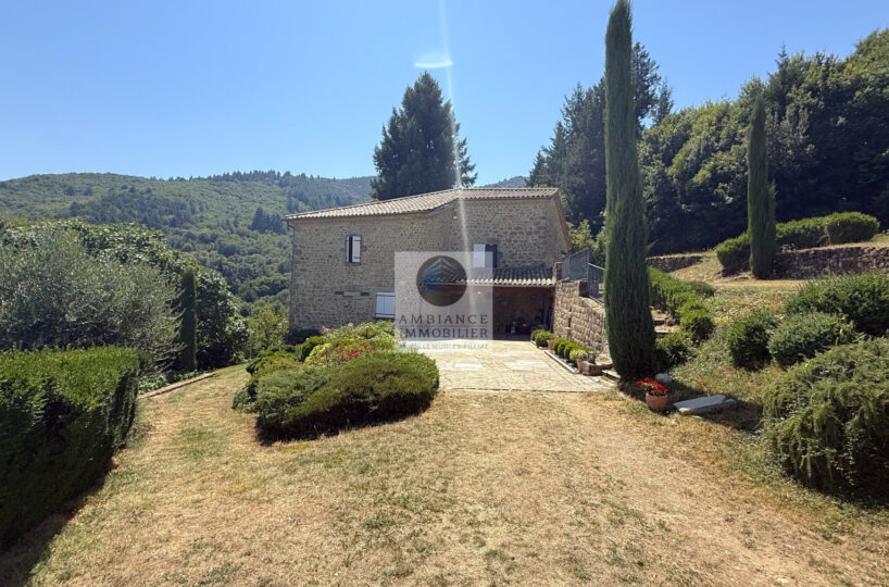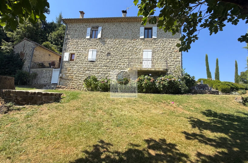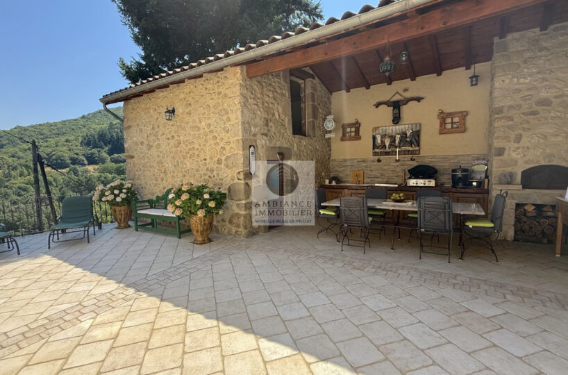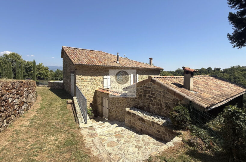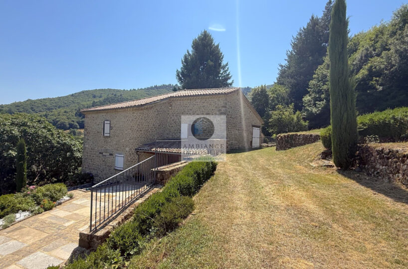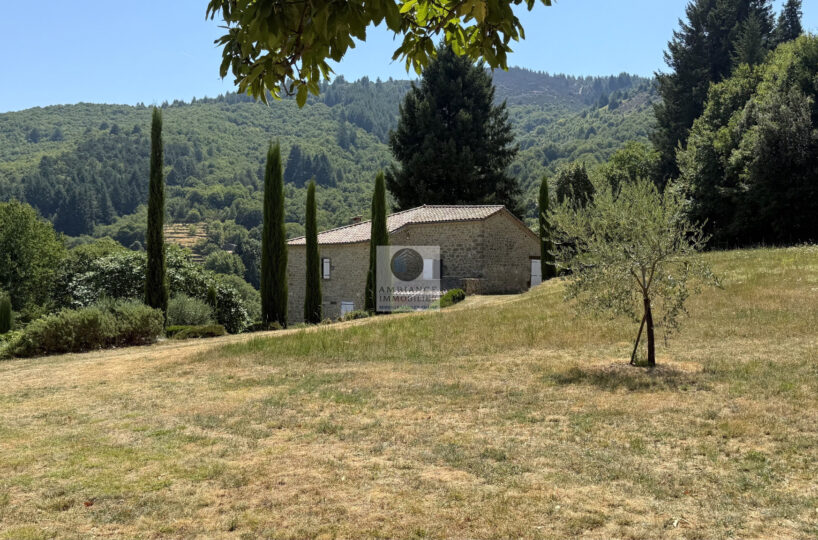 JAUJAC, en co-exclusivité, une vue exceptionnelle sur les monts d’Ardèche, une position dominante et la proximité d’un charmant village pour cette bâtisse en pierres de 218m2, typique des maisons ardéchoises sur une parcelle de 20 356m2 plantée de châtaigniers, d’oliviers, un magnifique verger et un potager.