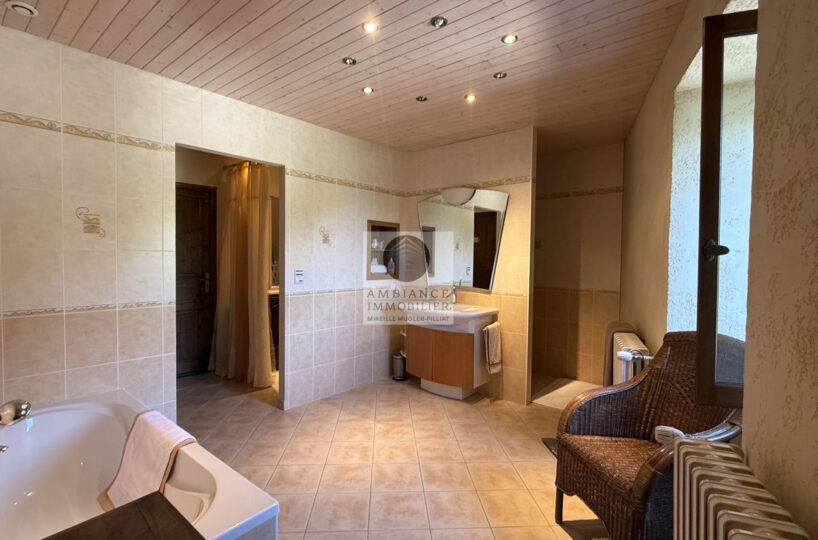 Au 1er étage : 3 chambres dont 1 chambre parentale de 35m2, un dressing familial et 1 salle de bains de 15m2 avec vasque, douche et baignoire.