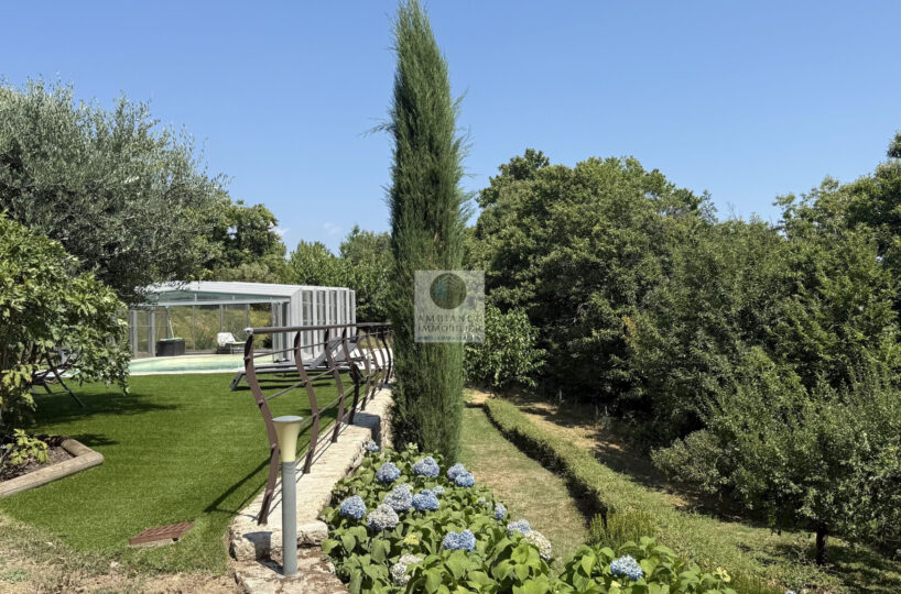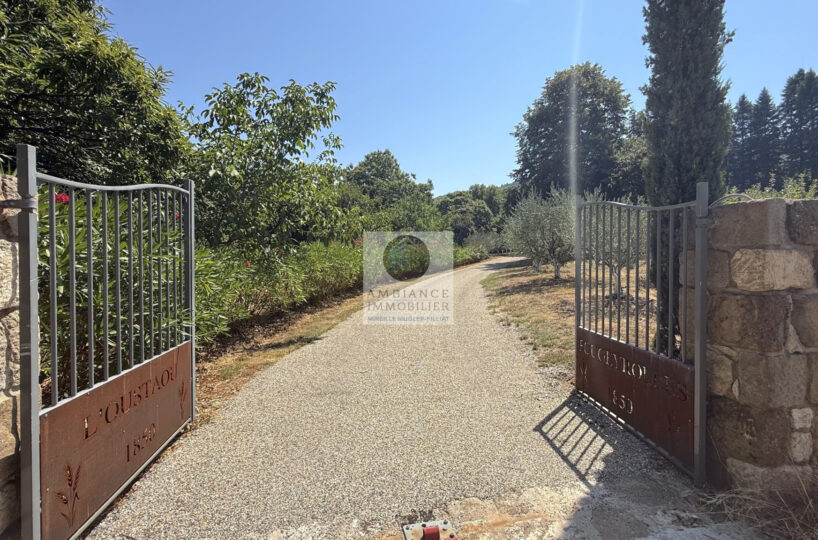 Dès l’entrée, un superbe portail en fer forgé, une allée d’oliviers et lauriers roses, une invitation à découvrir cette superbe propriété de 1850 dans un écrin de verdure.