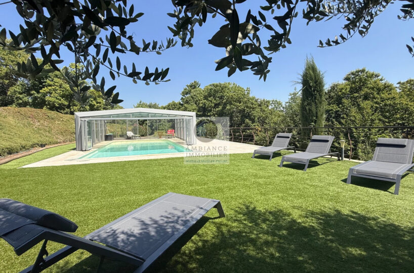 Un espace détente autour d’une magnifique piscine de 11,50m x 5m sécurisée par un abri télescopique avec d’ immenses baies vitrées pour profiter pleinement du paysage, son design contemporain s’accorde parfaitement avec la maison en pierres.
