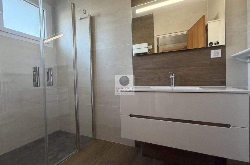 Un espace nuit avec 3 chambres dont 1 chambre parentale avec coin sanitaire, 1 salle d’eau avec vasque et douche à l’italienne.
