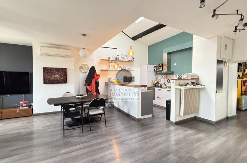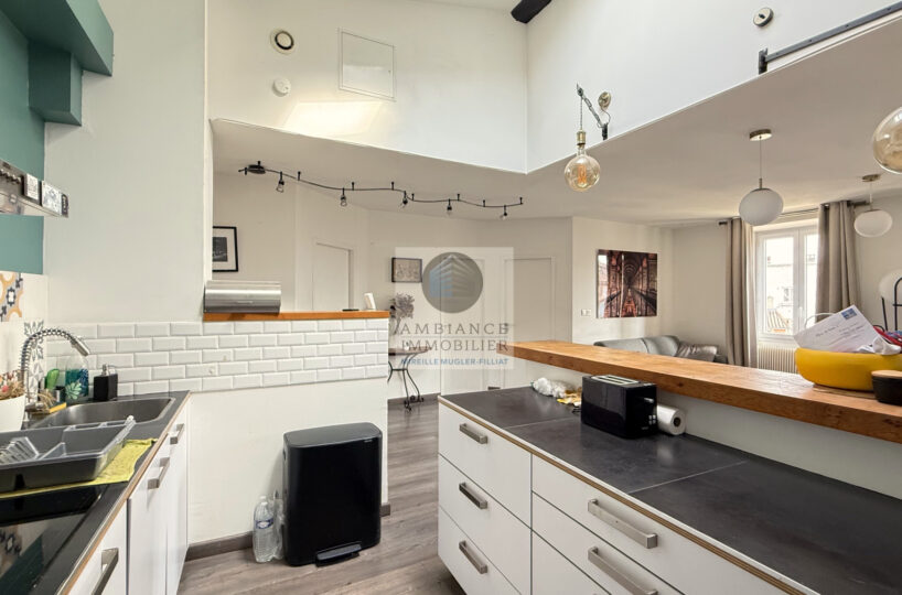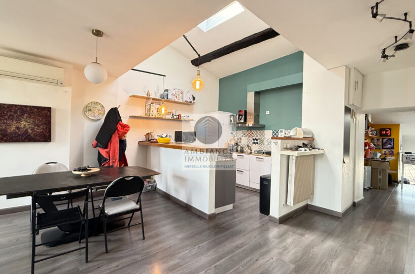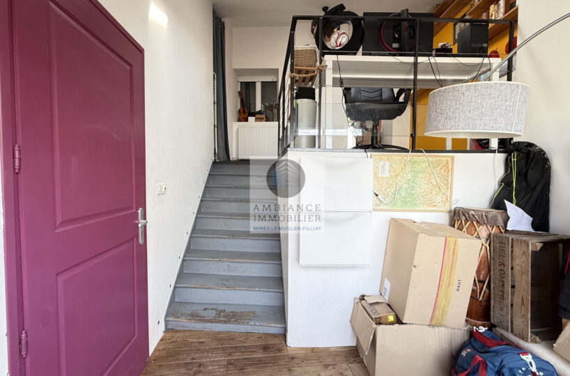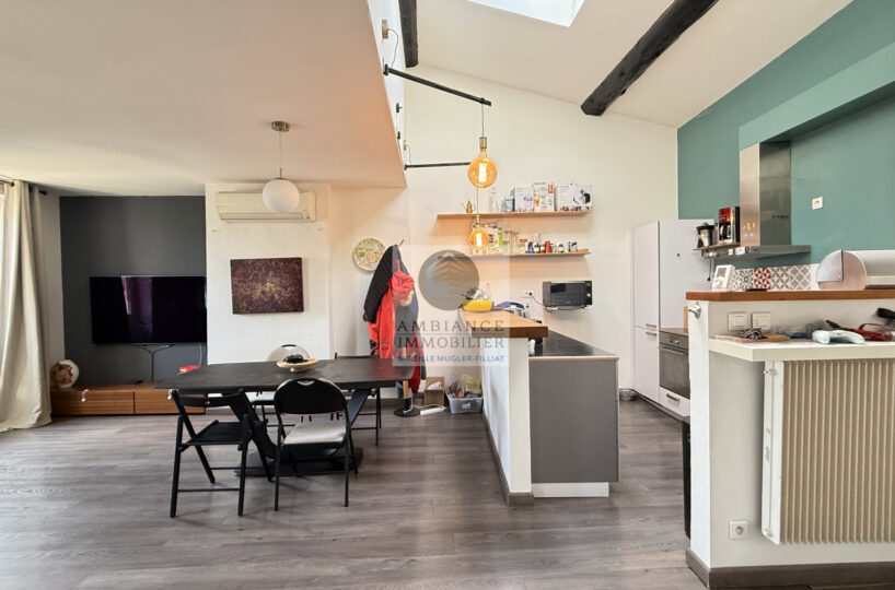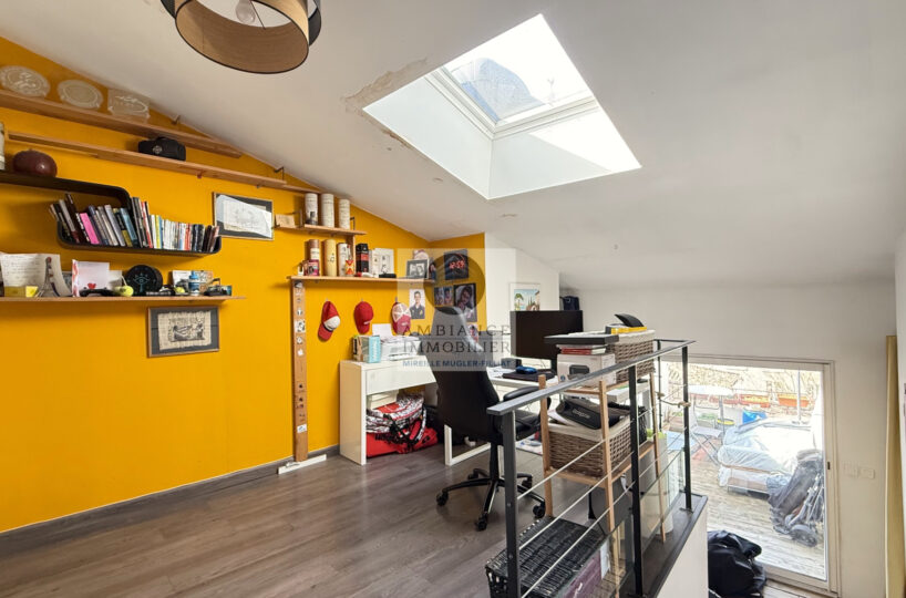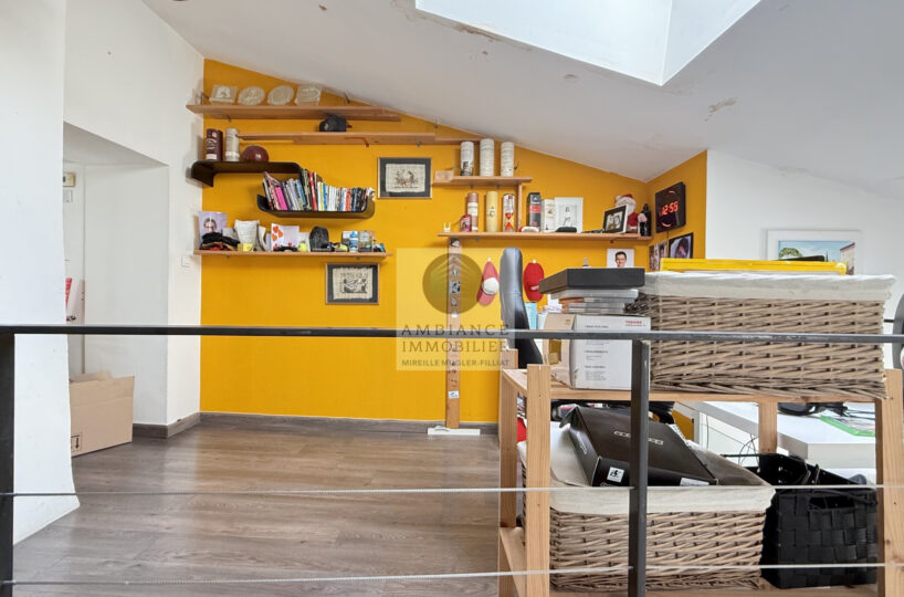 Une belle pièce de vie de 39m2 avec charpente apparente : cuisine intégrée ouverte sur le séjour-salon, un espace bureau de 10m2 en mezzanine, 1 chambre parentale de 11m2 avec un grand placard mural et 1 petite chambre pour enfant de 8m2 ou dressing, 1 salle de bains avec baignoire et vasque.