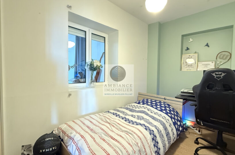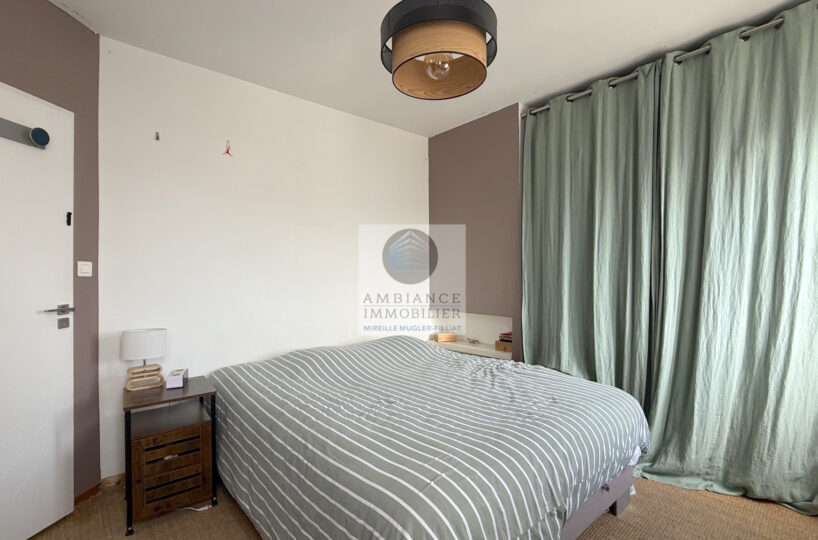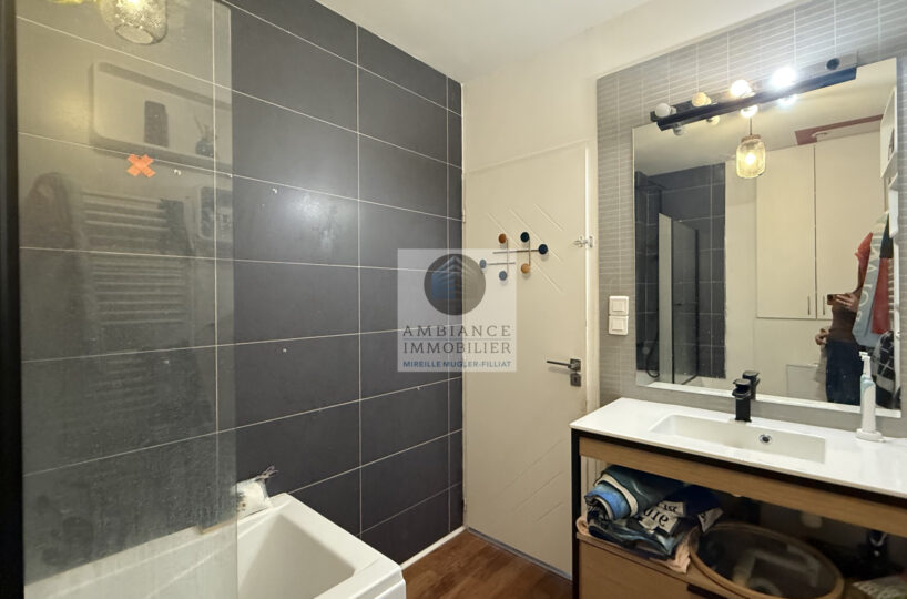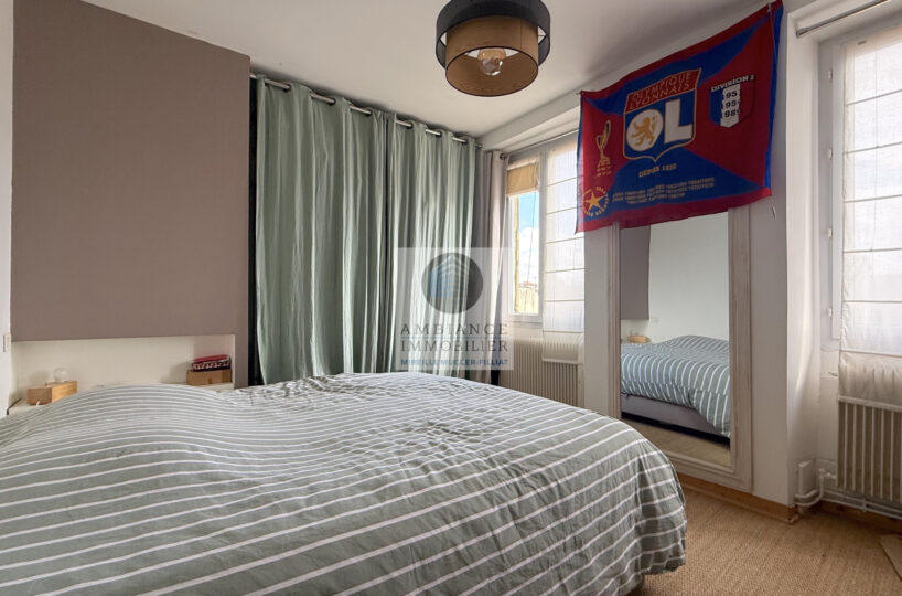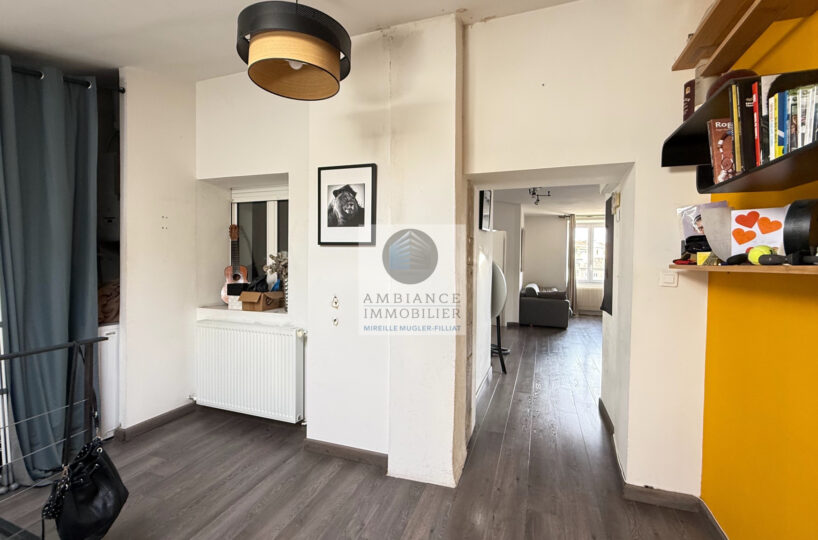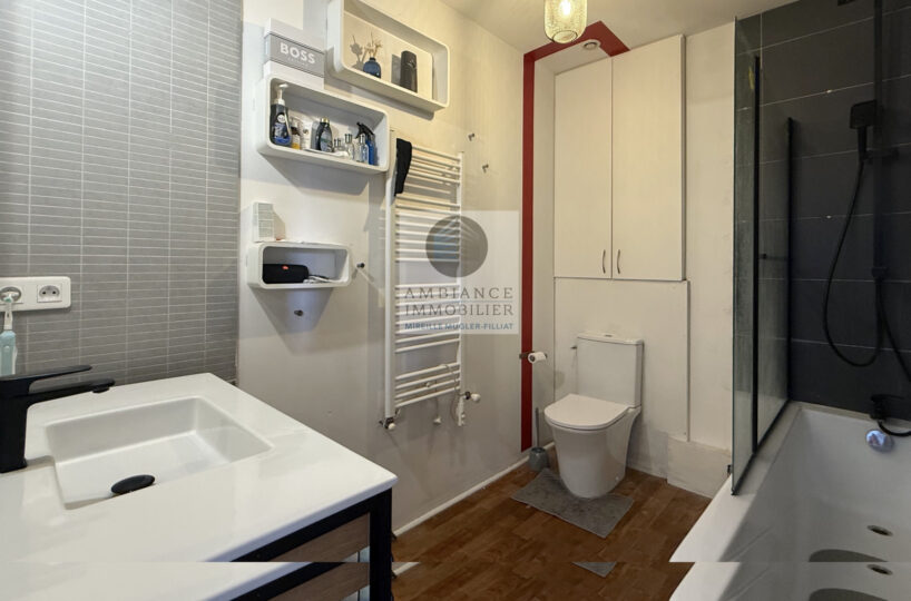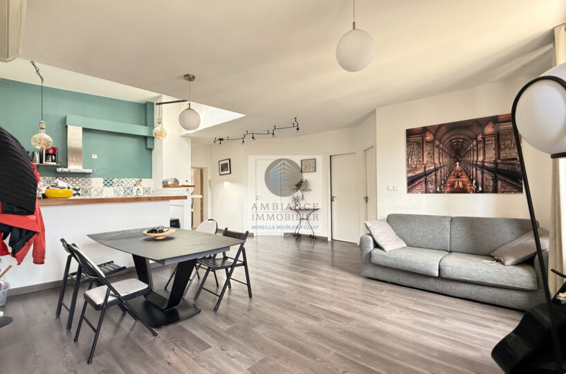 Une belle pièce de vie de 39m2 avec charpente apparente : cuisine intégrée ouverte sur le séjour-salon, un espace bureau de 10m2 en mezzanine, 1 chambre parentale de 11m2 avec un grand placard mural et 1 petite chambre pour enfant de 8m2 ou dressing, 1 salle de bains avec baignoire et vasque.