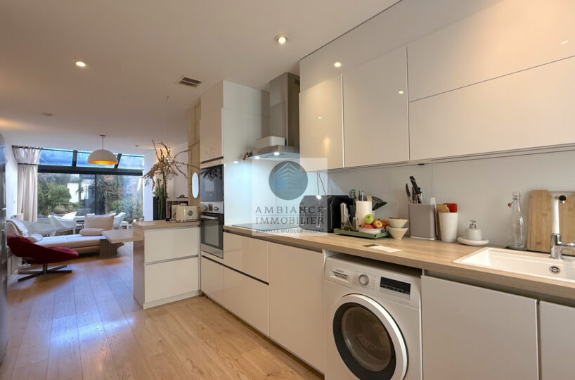 Une superbe pièce de vie : cuisine intégrée de 12m2 à 1/2 ouverte sur un salon-séjour de 21m2 avec toute une façade en baies vitrées offrant une belle perspective sur le patio joliment végétalisé.