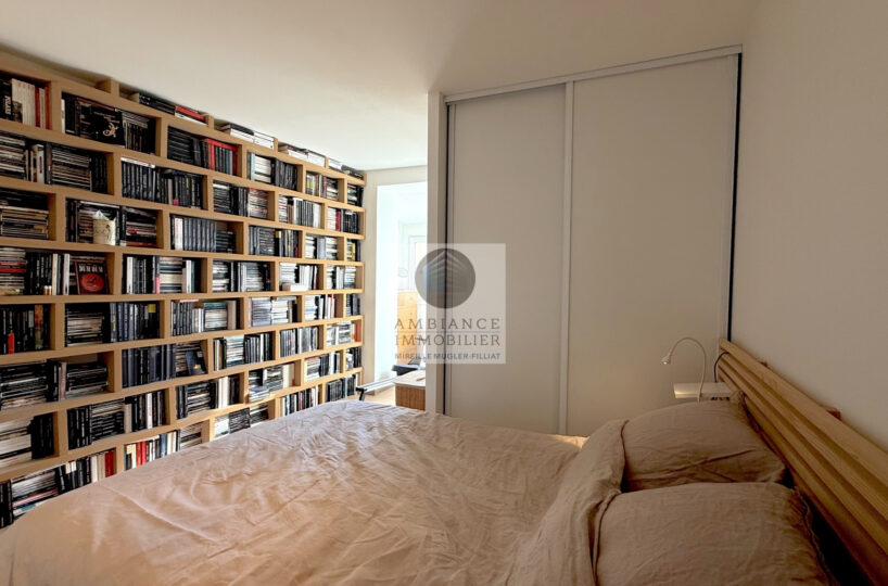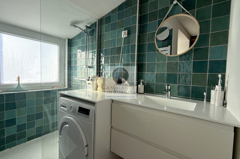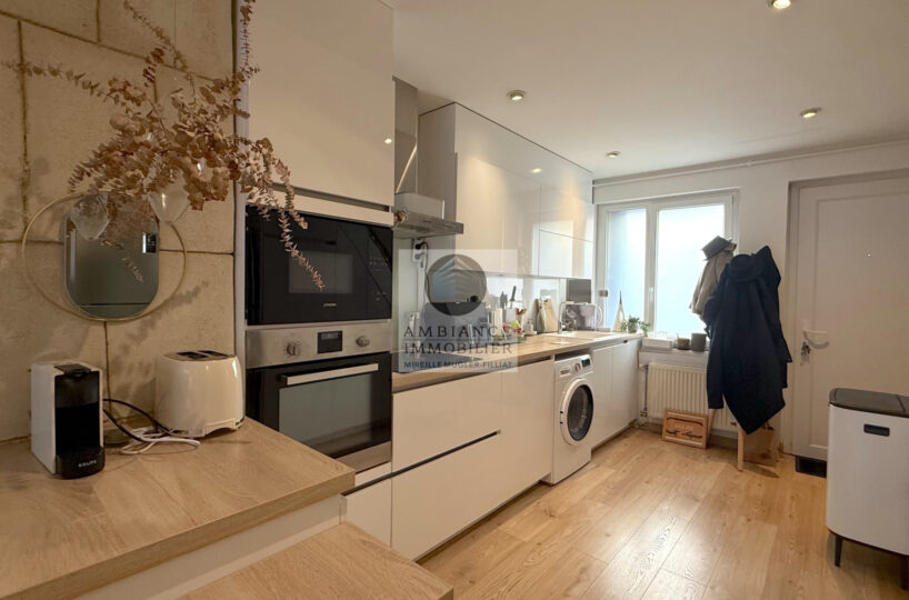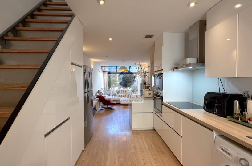 Une superbe pièce de vie : cuisine intégrée de 12m2 à 1/2 ouverte sur un salon-séjour de 21m2 avec toute une façade en baies vitrées offrant une belle perspective sur le patio joliment végétalisé.