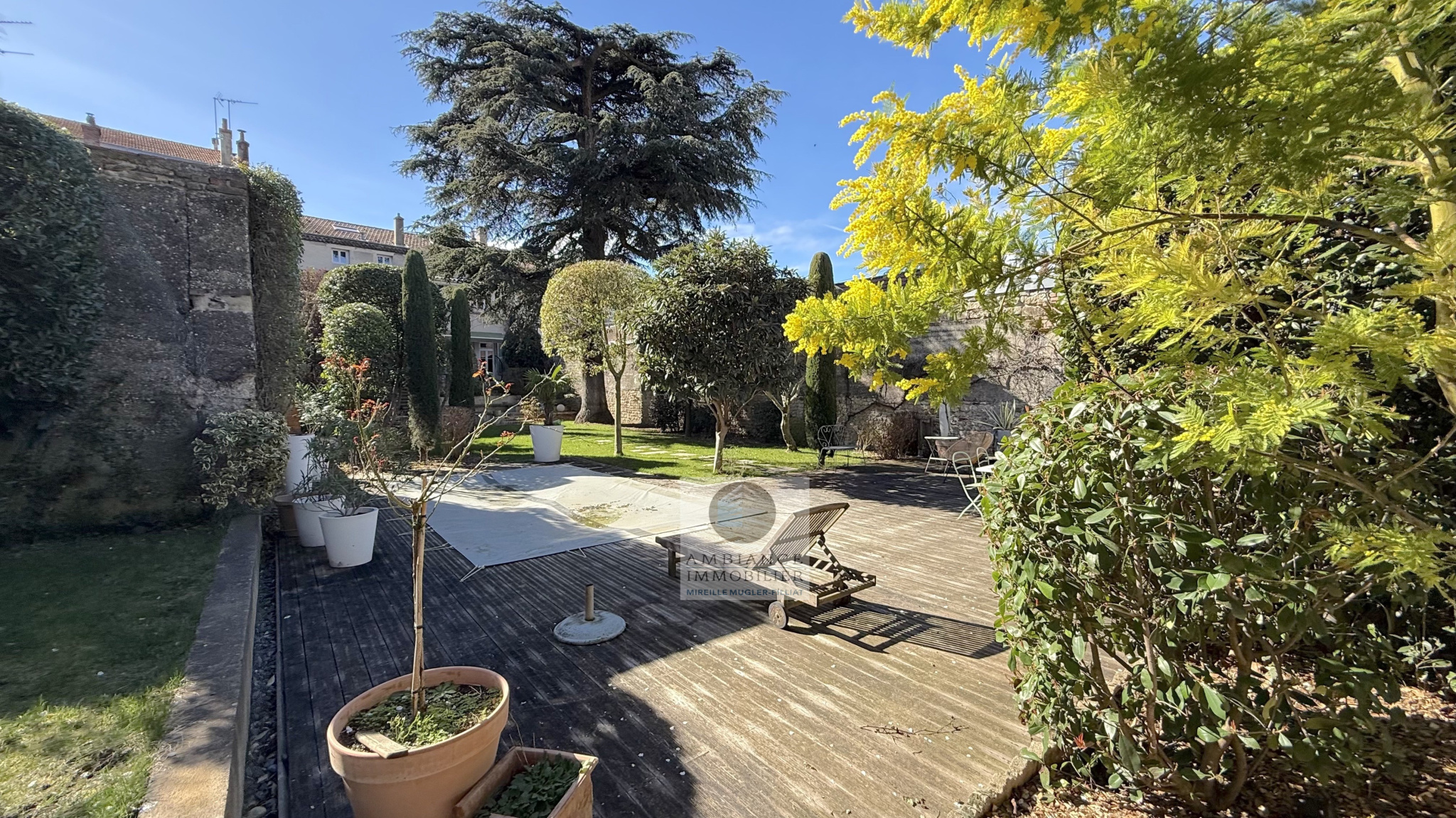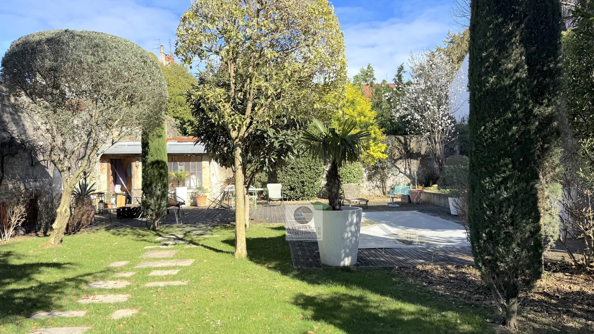 De superbes terrasses prolongent les espaces de vie, le jardin joliment paysager est une véritable parenthèse de sérénité, la piscine de 6m x 3m s’intègre harmonieusement dans cet écrin végétal – arrosage intégré avec l’eau du puits.