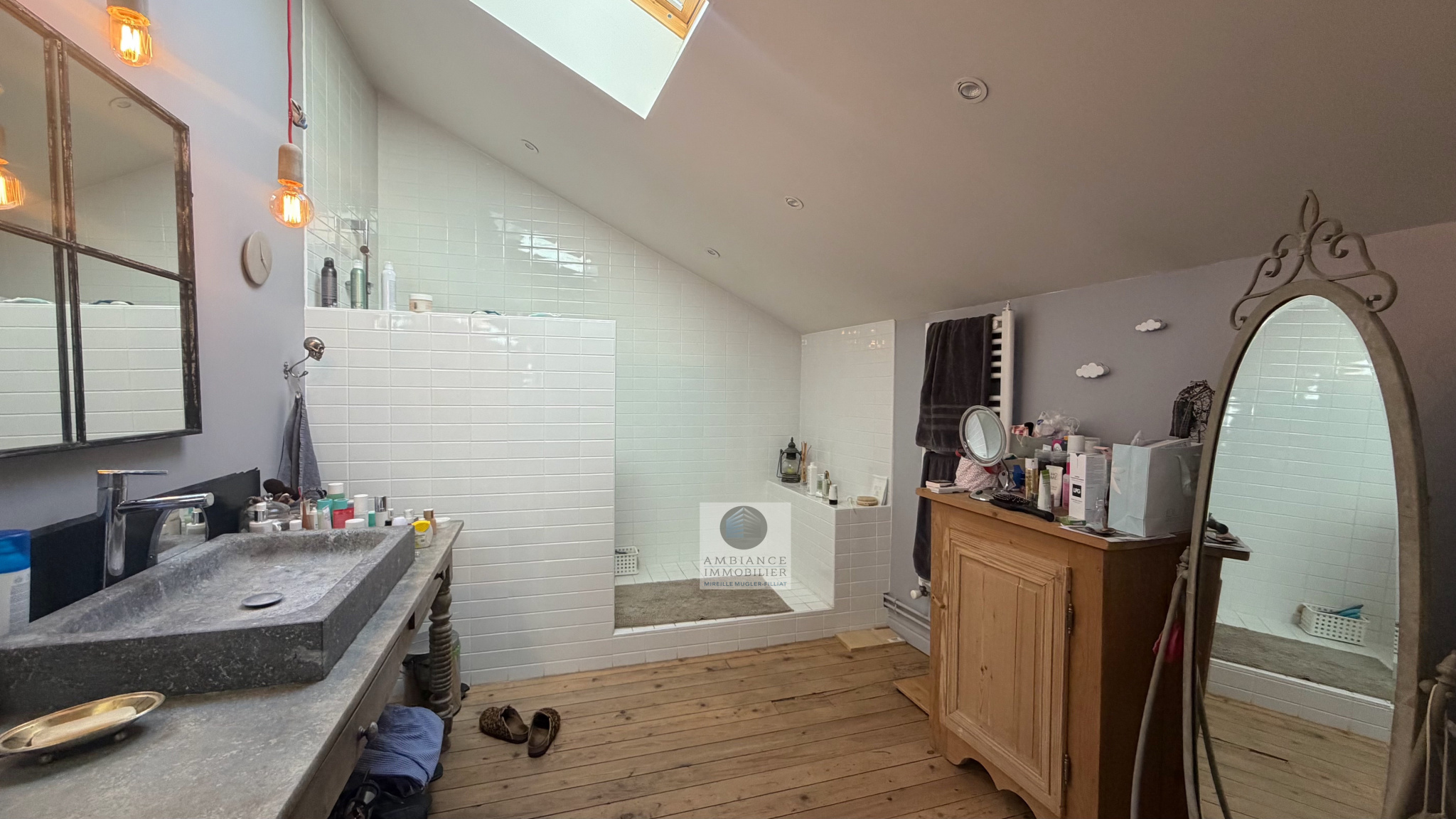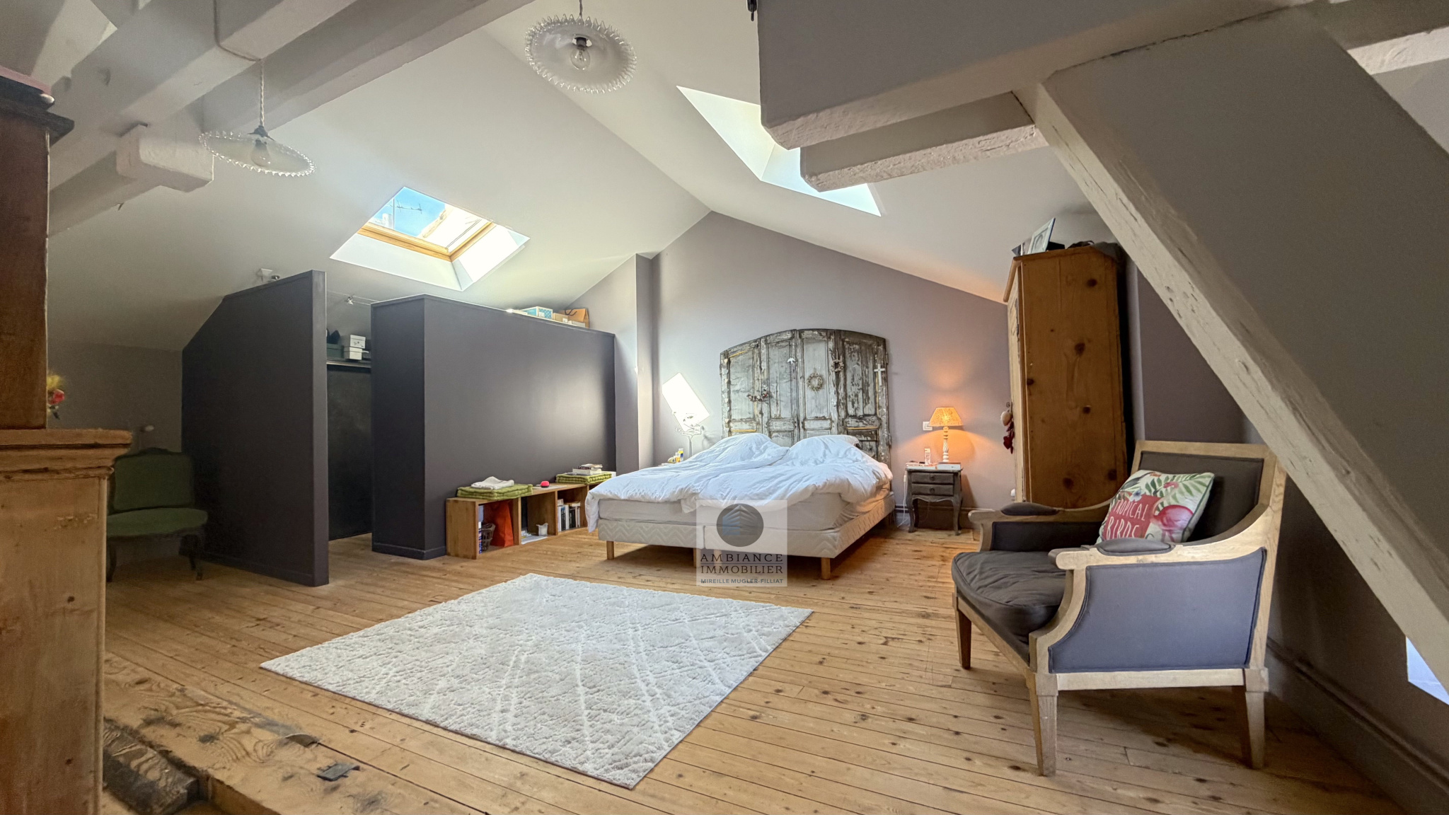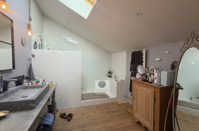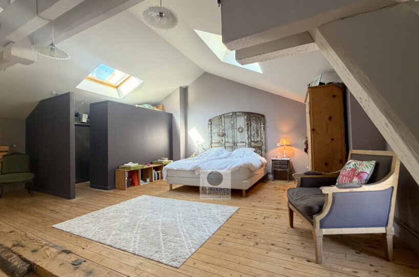 Le 2ème étage, une superbe suite parentale de 50m2 avec charpente apparente : dressing aménagé, salle d’eau avec vasques et douche à l’italienne, 1 salle de jeux de 24m2 pouvant être aménagée en chambre.