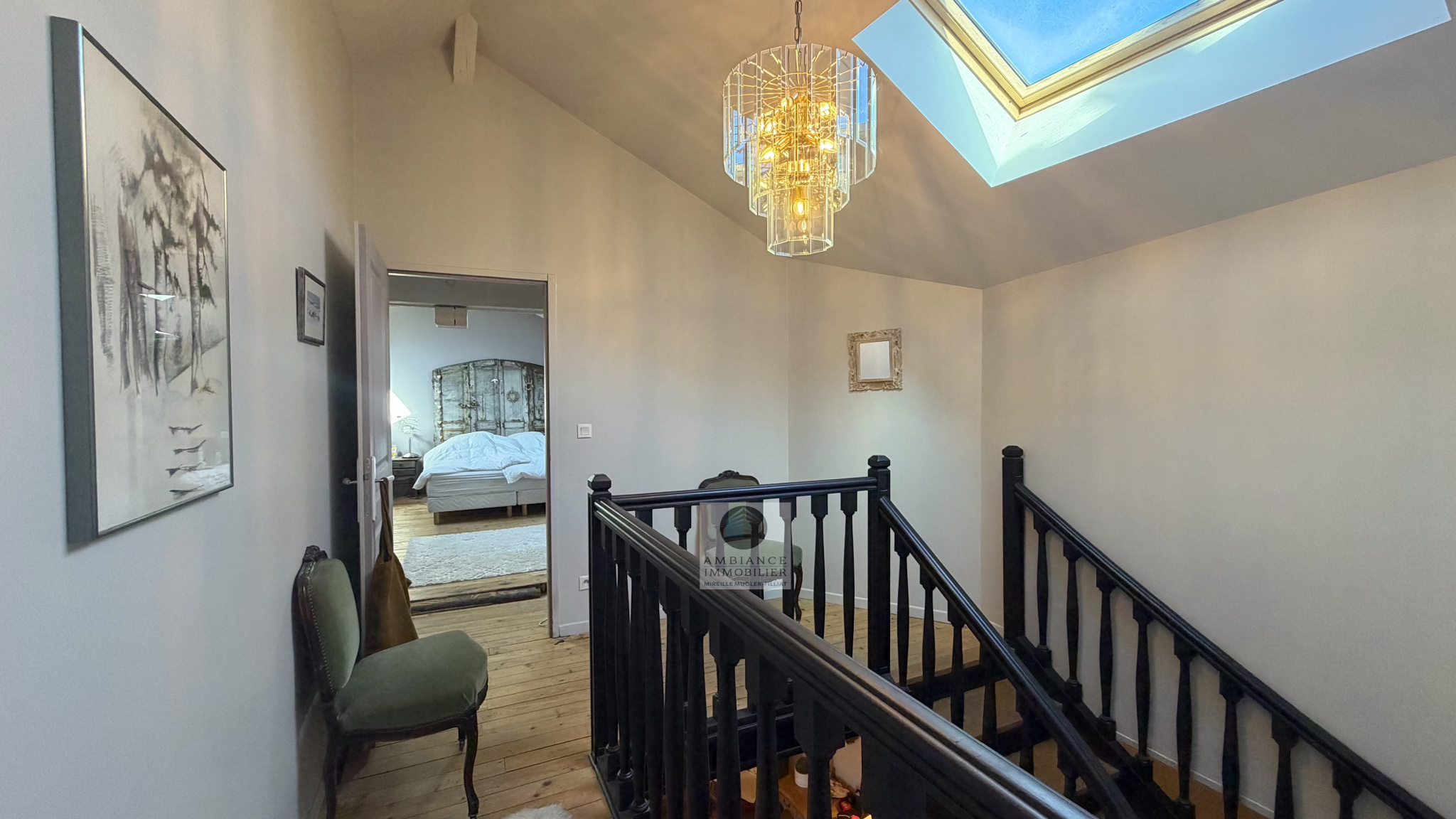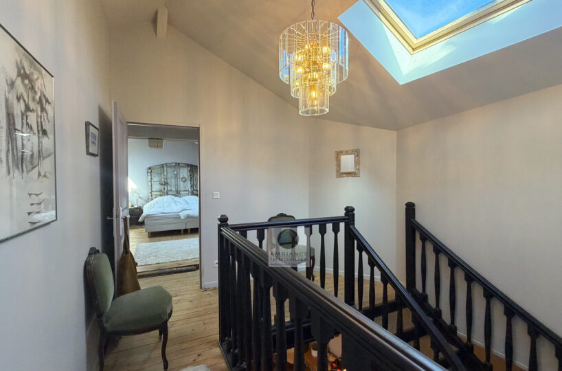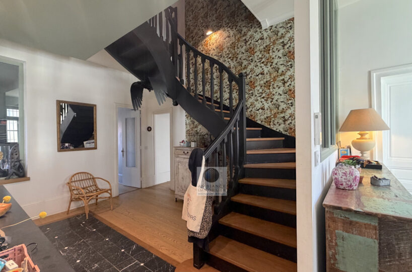 Un superbe escalier pour accéder au 1er étage, lieu d’intimité familiale : un salon TV/bibliothèque de 24m2 et l’espace nuit enfants avec 1 salle d’eau et 4 chambres dont 1 suite de 22m2 avec salle de bains.