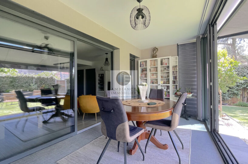 Une pièce de vie de 43m2 : une cuisine dînatoire intégrée ouverte sur le salon, une salle à manger dans une véranda offrant une belle perspective sur le jardin.