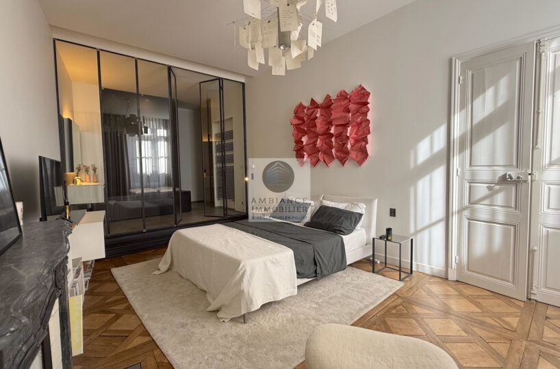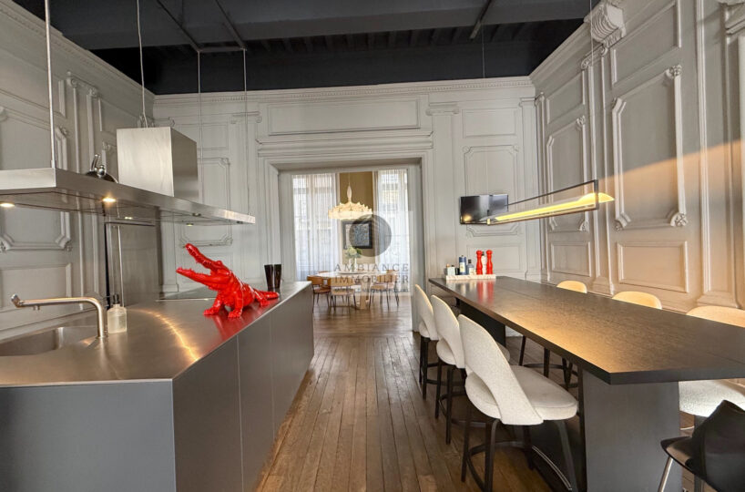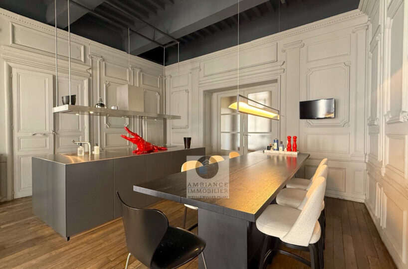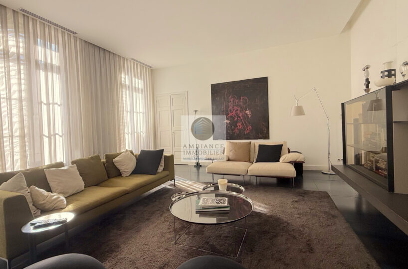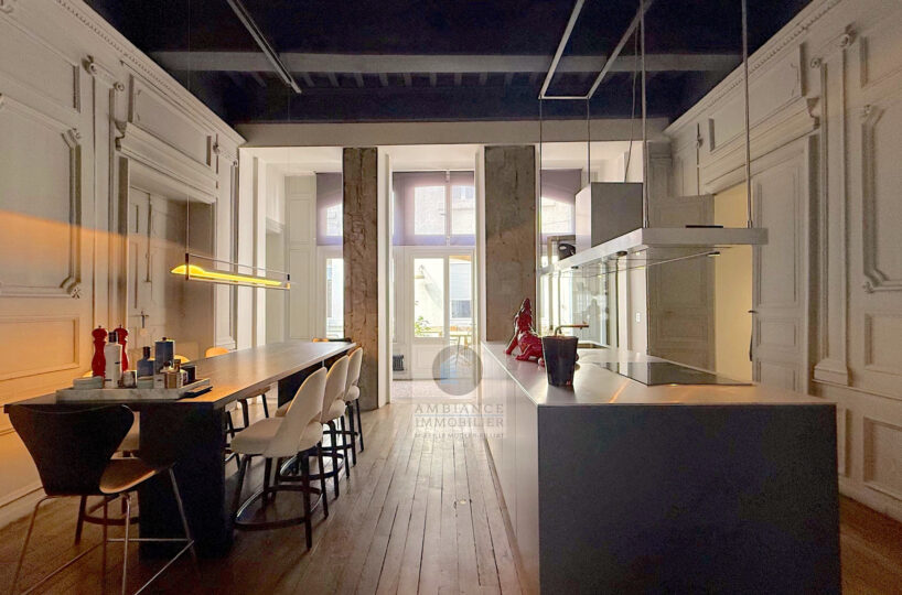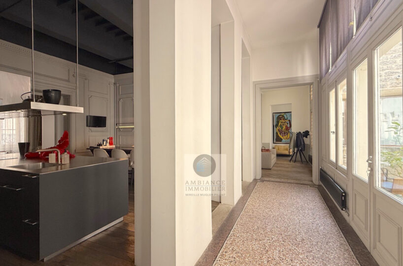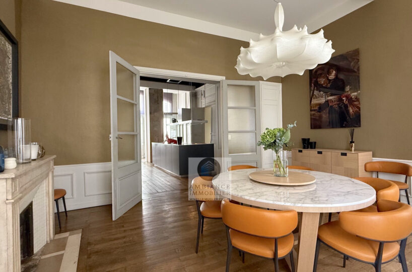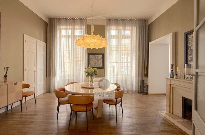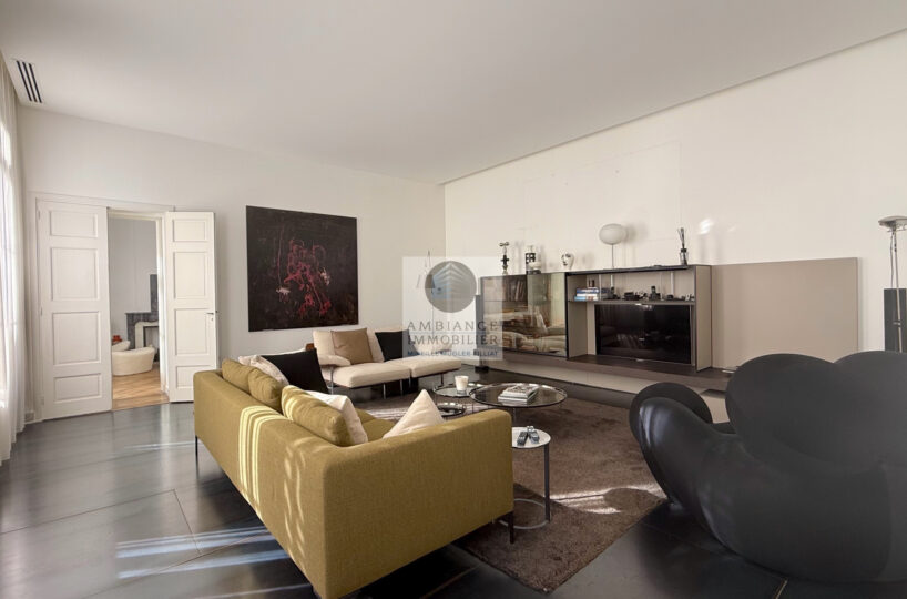 VALENCE centre historique dans un superbe hôtel particulier, de beaux volumes, l’alliance réussie d’une rénovation contemporaine avec le caractère authentique préservé pour cet appartement de 358m2 avec terrasse et garage.