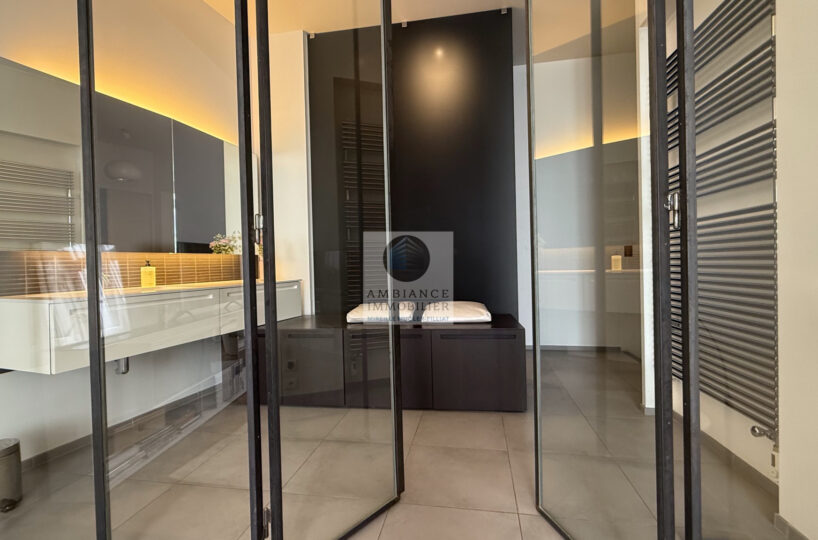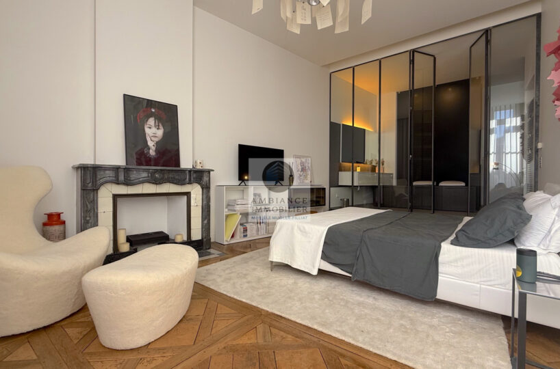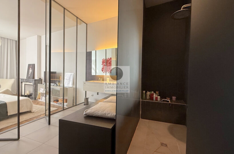 Une magnifique et élégante suite parentale de 52m2 avec verrière : chambre de 23m2 avec parquet marqueterie, salle d’eau avec douche à l’italienne et vasque, un superbe dressing.