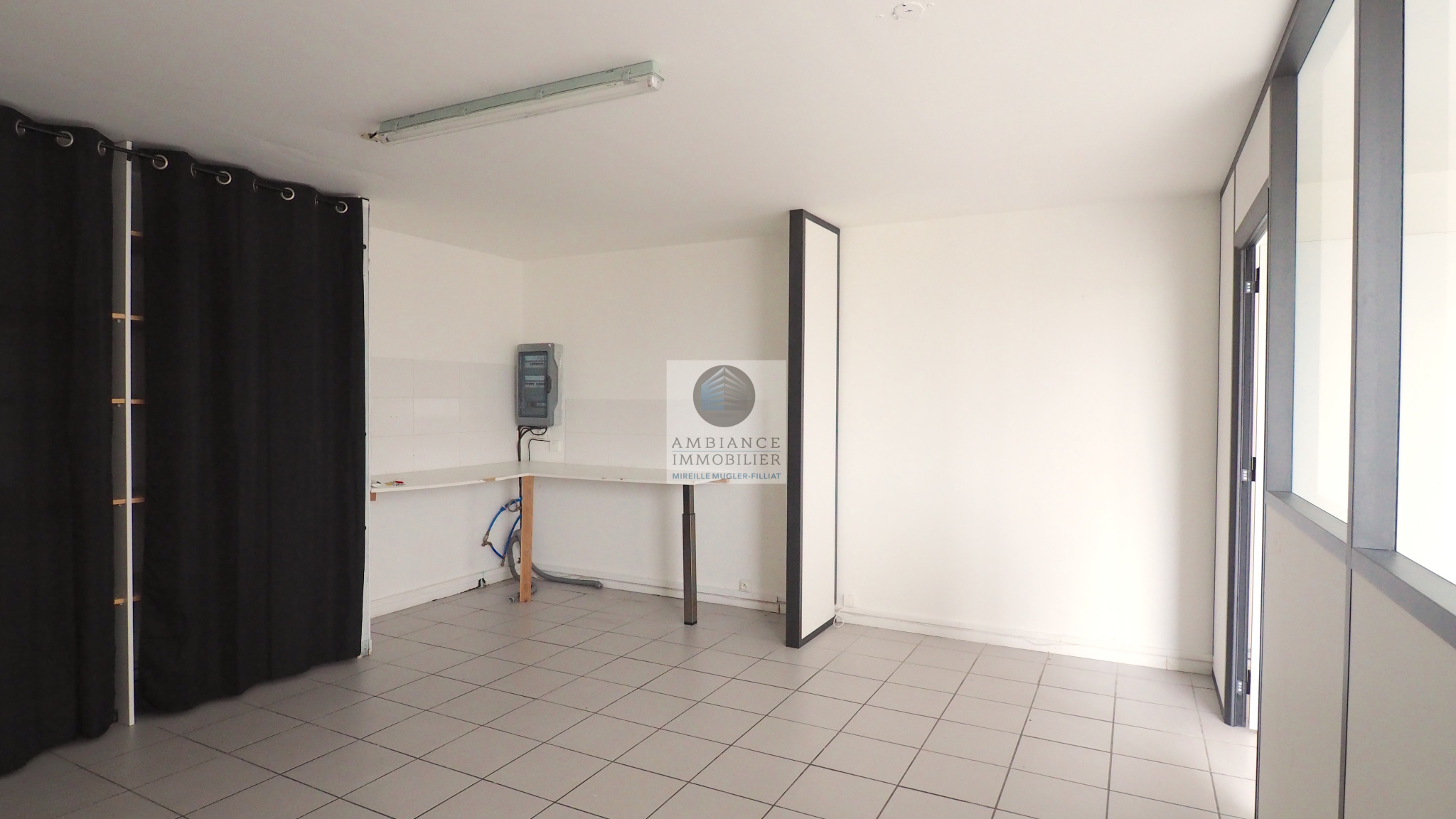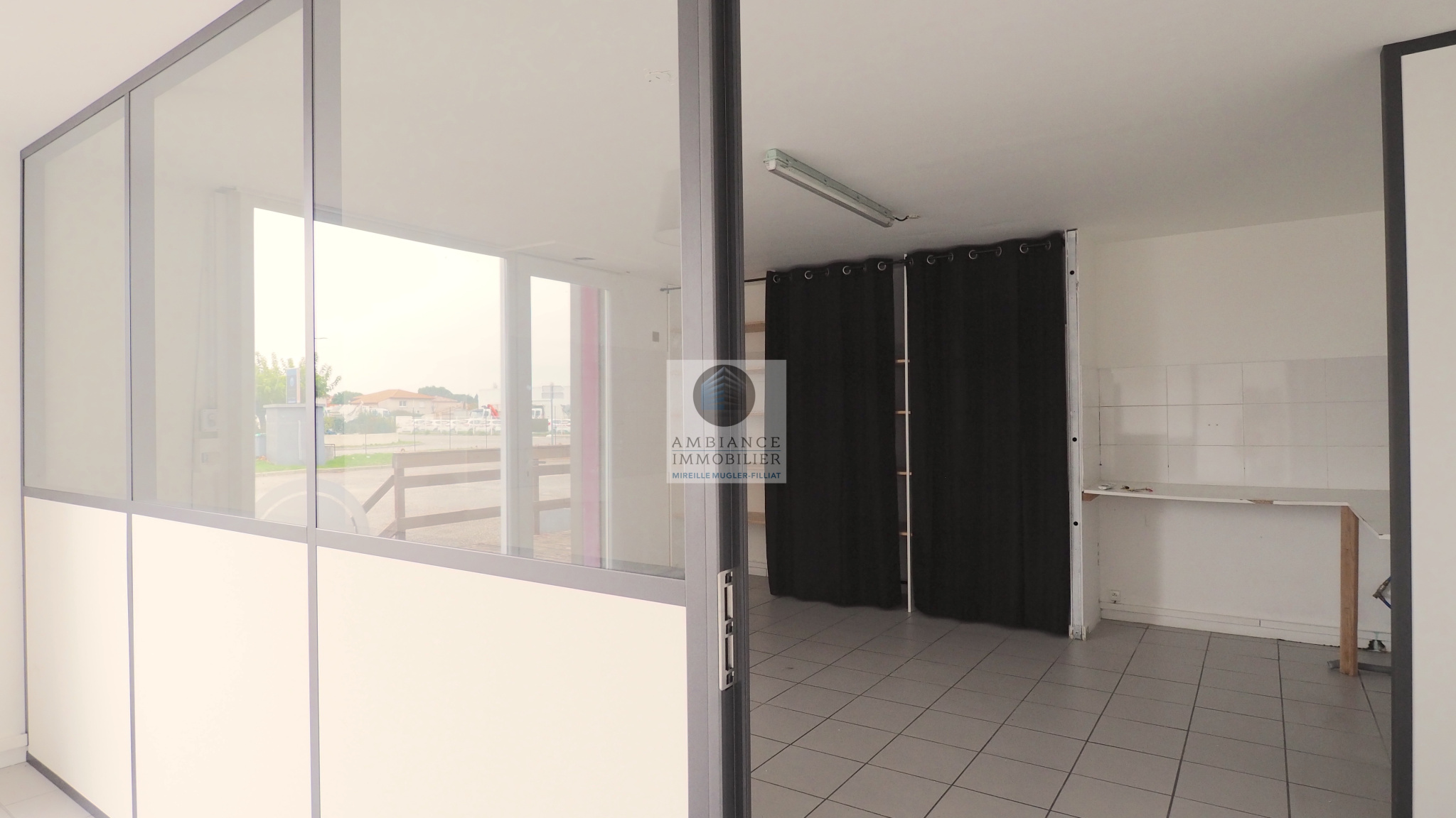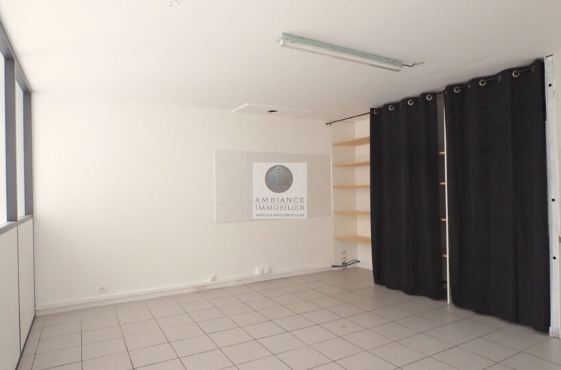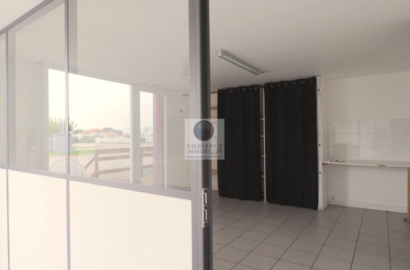 Une pièce principale de 45m2 avec de grandes baies vitrées en alu et 2 portes d’accès offrant la possibilité de cloisonnement en 2 espaces, un bureau de 24m2, sanitaires, archives.