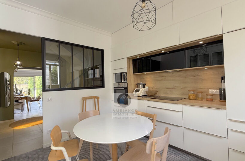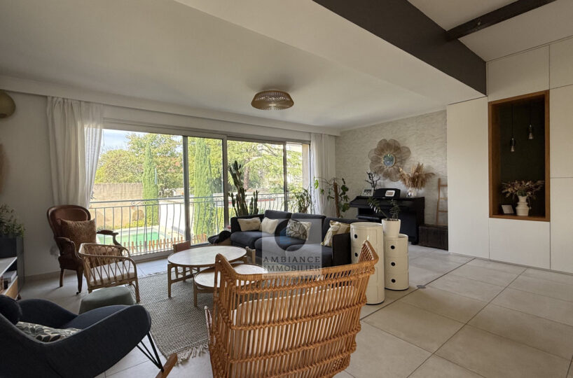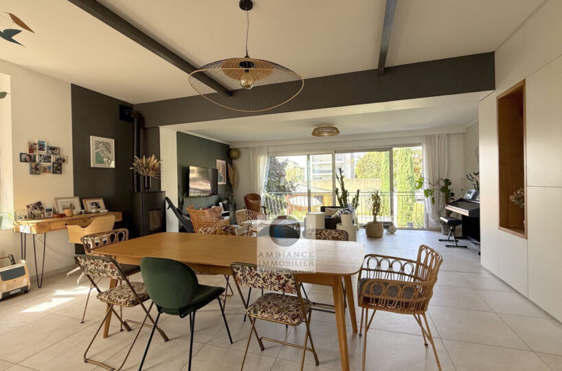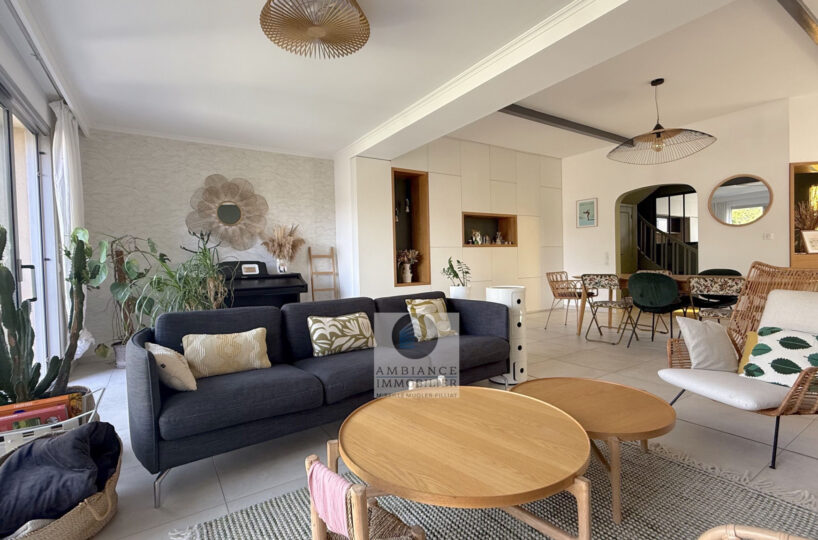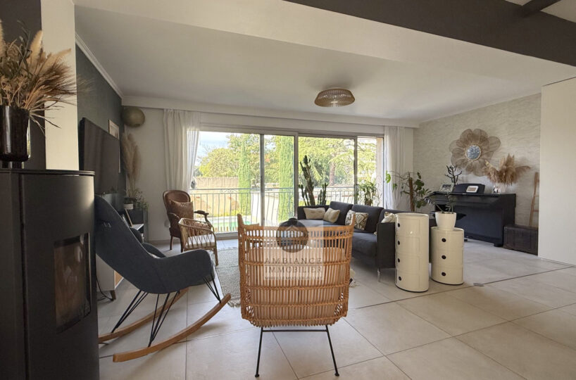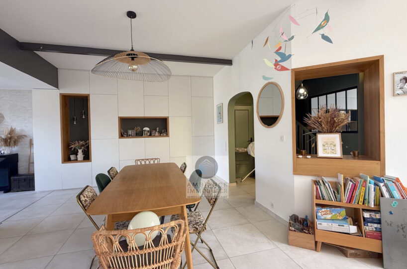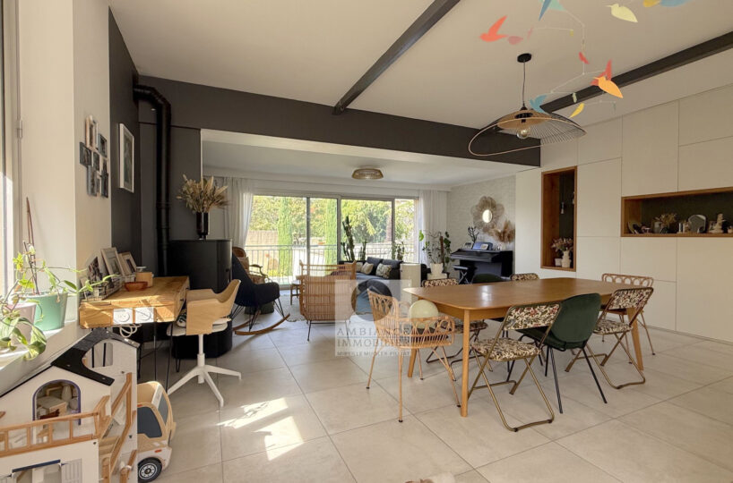 Une superbe pièce de vie de 63m2 avec toute une façade en baies vitrées offrant une belle perspective sur le jardin et la piscine : salon-séjour avec poêle à granules et un pan de mur en bibliothèque et placards joliment conçus par une architecte d’intérieur, cuisine intégrée de 13m2 avec une verrière.