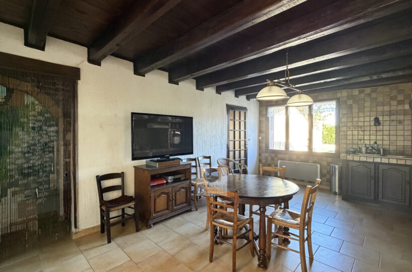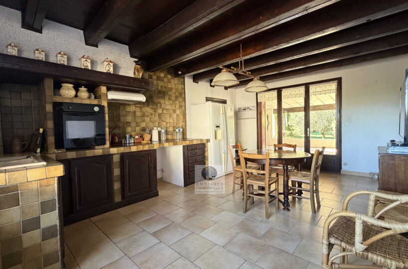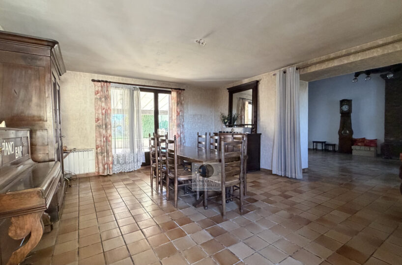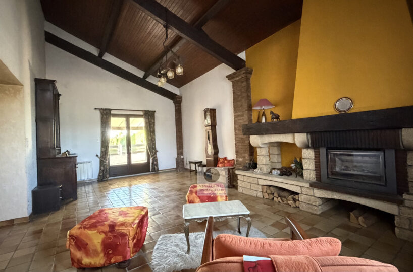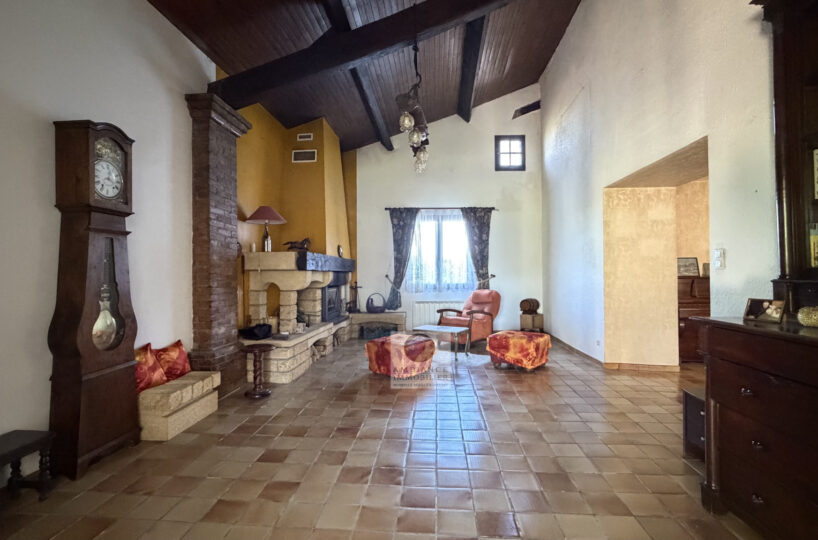 De beaux espaces de vie : un salon de 36m2 avec une charpente apparente et une cheminée à foyer fermé, un séjour de 29m2 et une cuisine intégrée de 25m2.