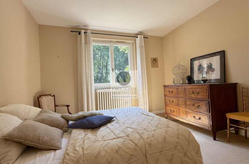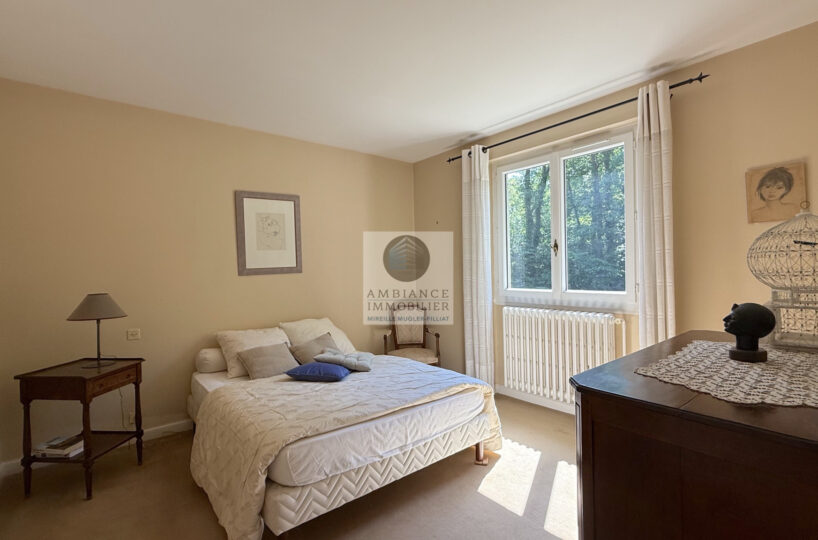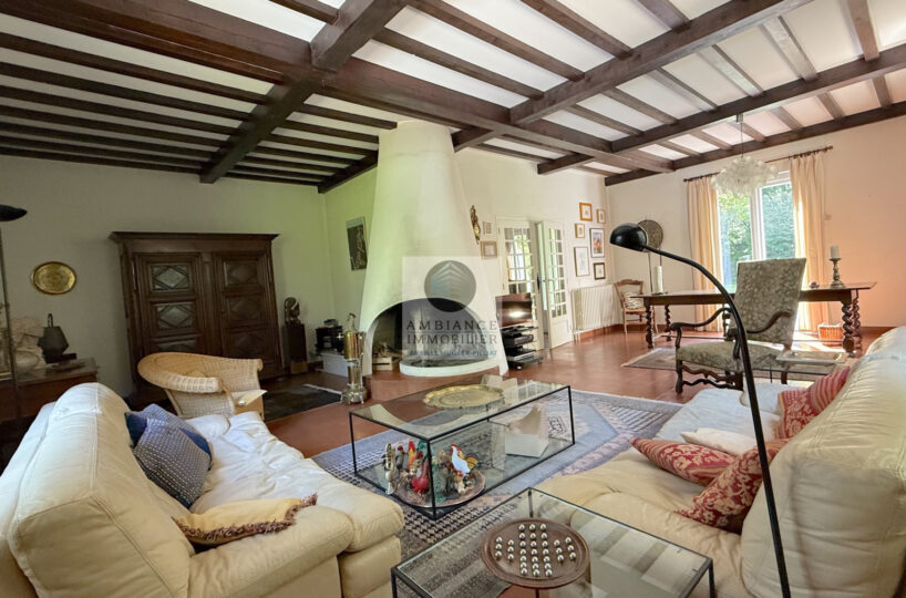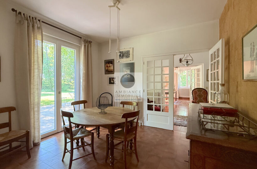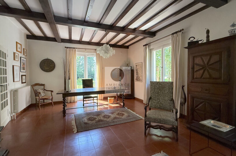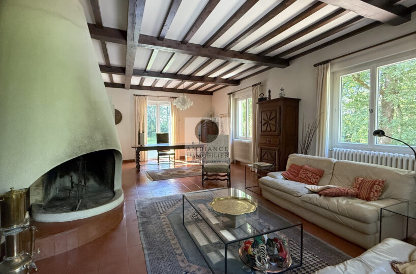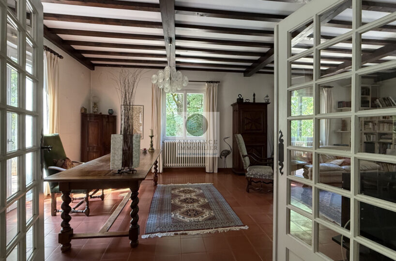 Une entrée lumineuse desservant les pièces de vie : un salon-séjour de 50m2 avec une cheminée originale et des plafonds à la française, de grandes ouvertures offrant une belle perspective sur le jardin, une cuisine dînatoire de 21m2, une buanderie et une chambre d’amis.
