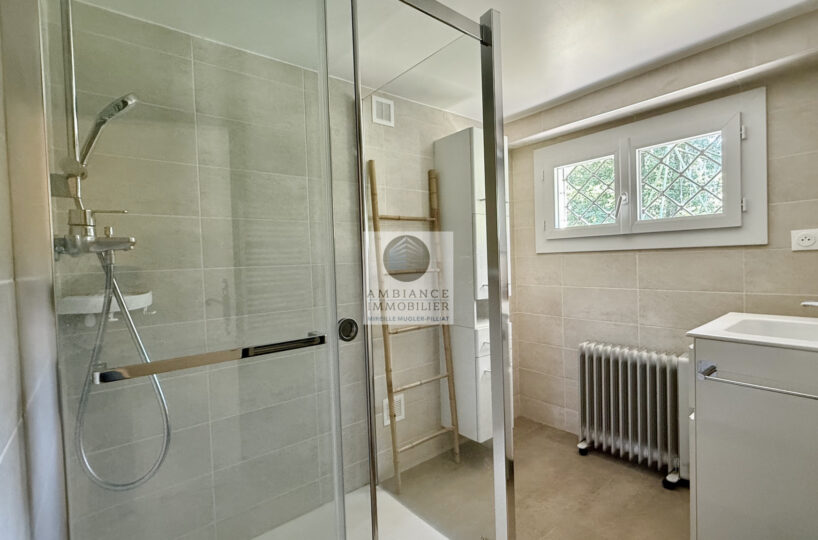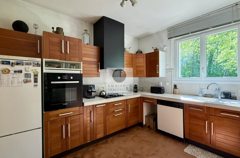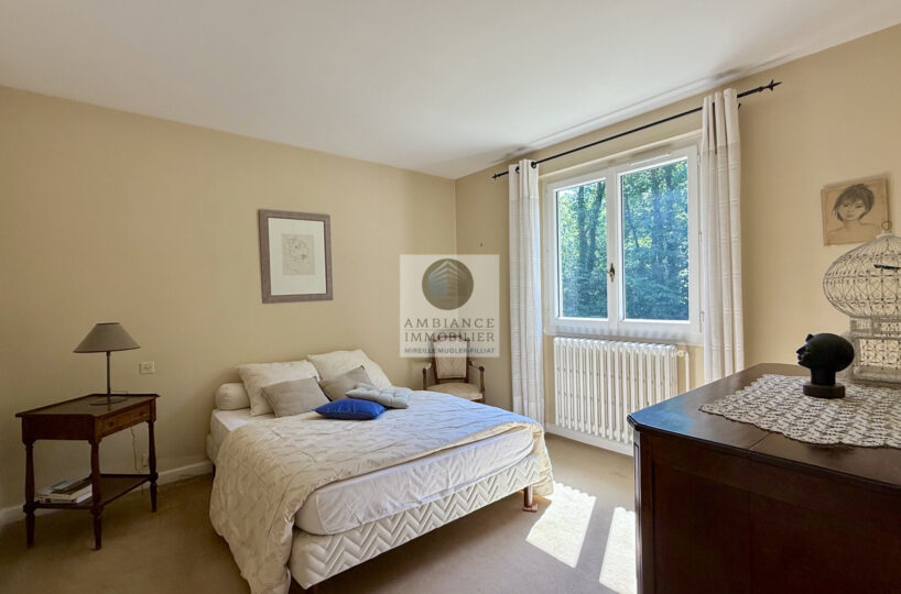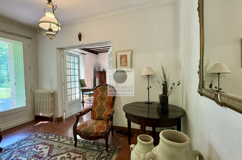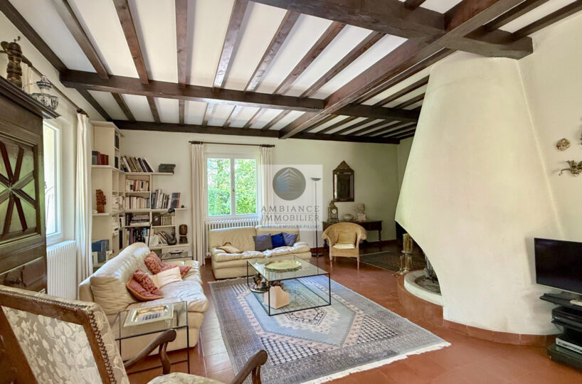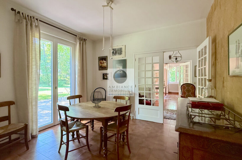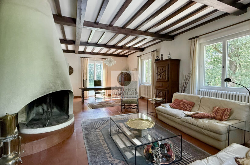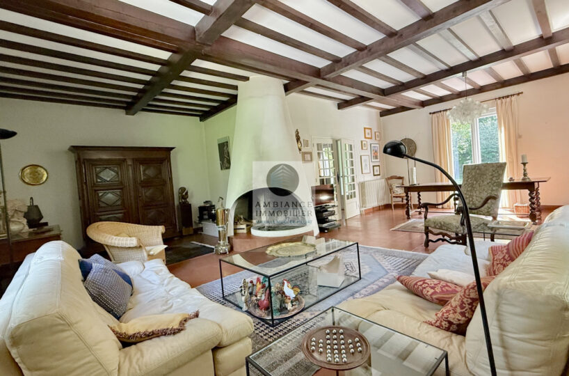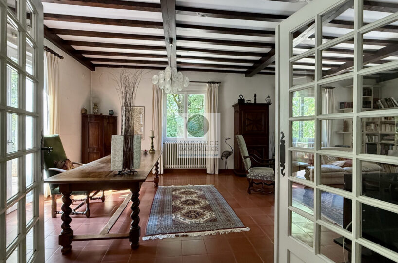 Une entrée lumineuse desservant les pièces de vie : un salon-séjour de 50m2 avec une cheminée originale et des plafonds à la française, de grandes ouvertures offrant une belle perspective sur le jardin, une cuisine dînatoire de 21m2,une buanderie et une chambre d’amis.