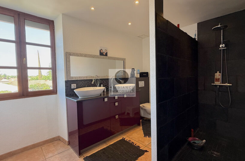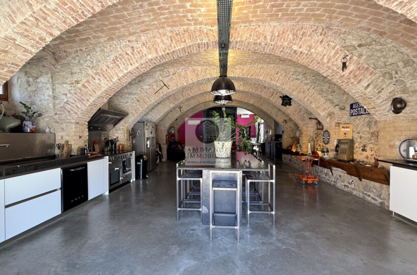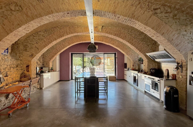 Une magnifique pièce de vie voûtée : salon-séjour cuisine intégrée avec de grandes baies vitrées offrant une belle perspective sur l’extérieur, buanderie/cellier, une suite parentale avec dressing et salle d’eau : douche à l’italienne et vasque.