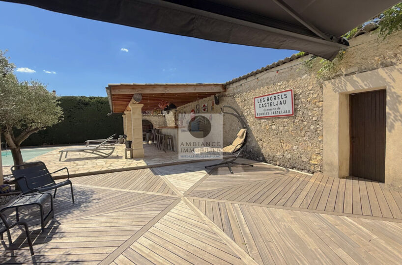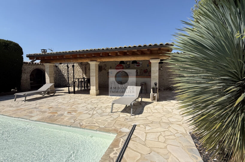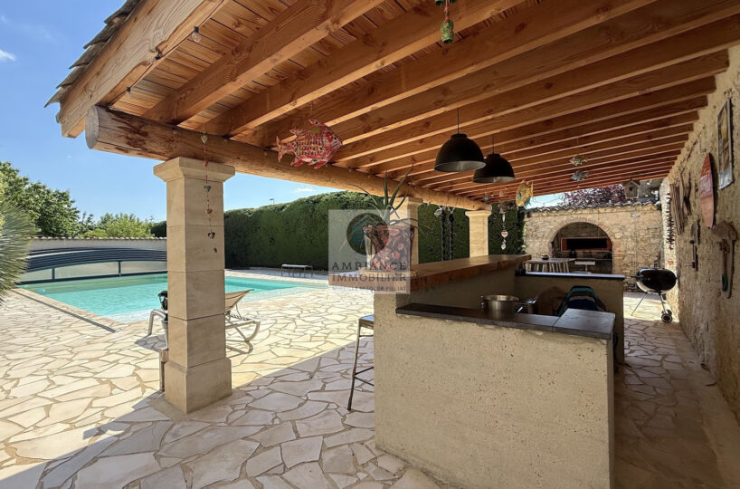 De belles ambiances de terrasses avec un bar, un barbecue, un four à pain et une piscine de 13m x 7m sécurisée par un dôme.