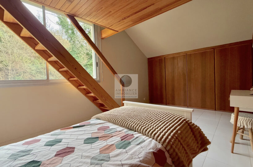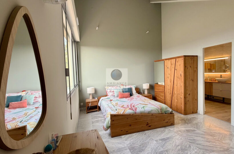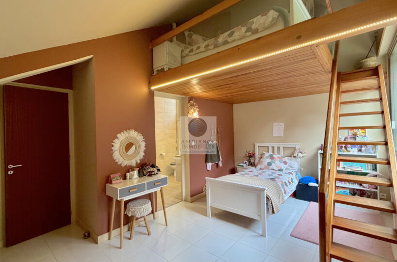 Un espace nuit : 1 suite parentale de 20m2 avec salle de bains et 1 suite enfant de 13m2 avec petite salle d’eau.