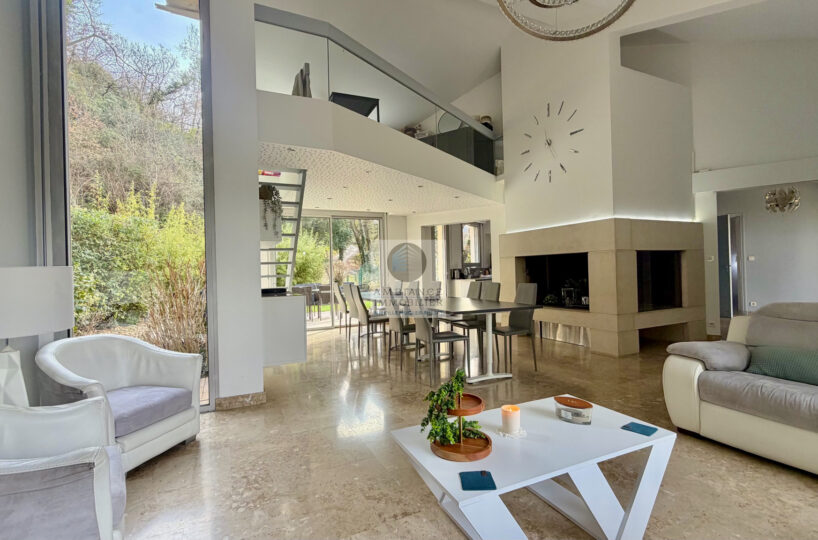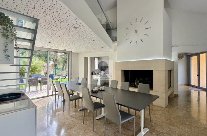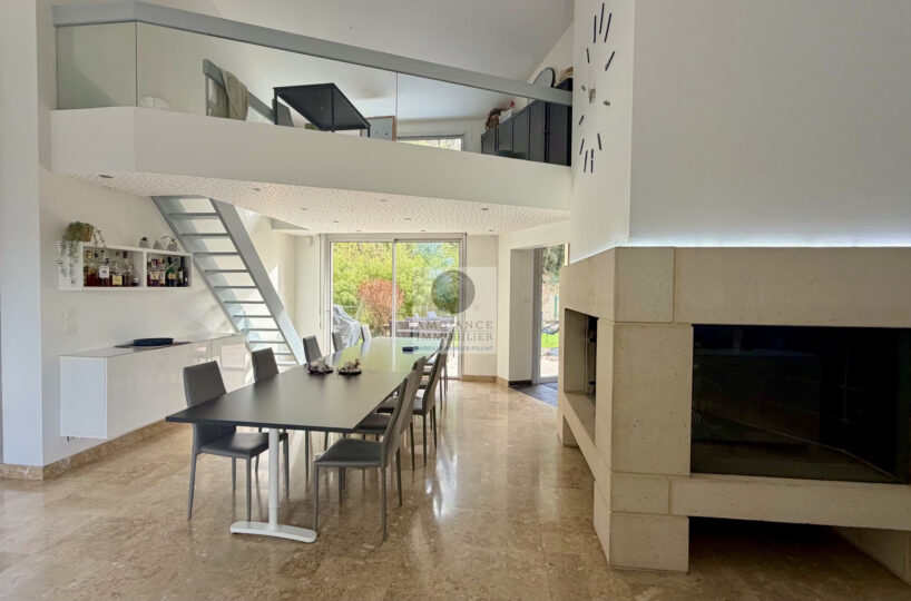 Un hall d’entrée spacieux et vitré desservant un salon-séjour de 50m2 avec un plafond cathédrale et une cheminée monumentale, un espace lecture ou jeux en mezzanine surplombant la pièce de vie, une cuisine joliment intégrée, un bureau ou chambre d’amis.