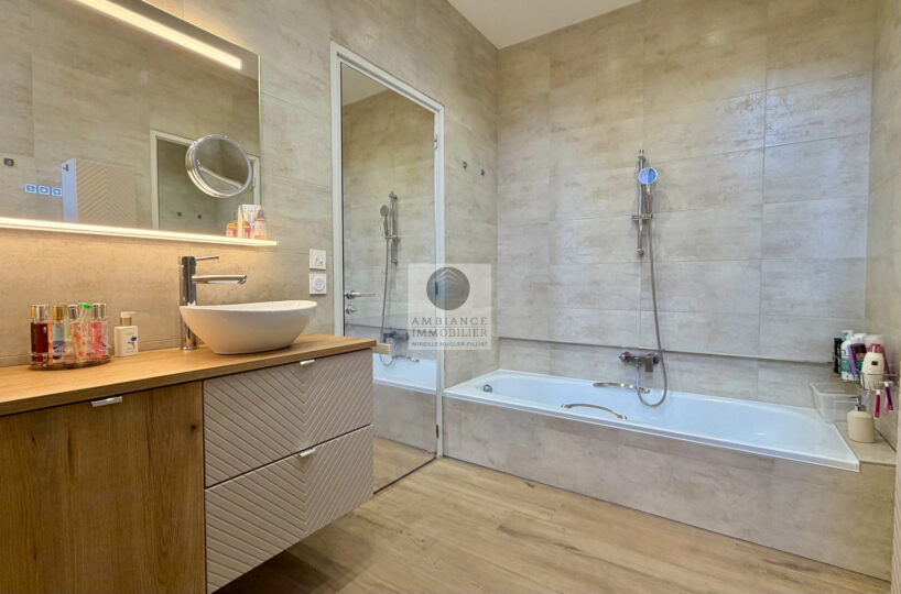 Au 1er étage : 1 chambre de 16m2 avec grands placards/dressing et 1 chambre de 18m2 avec placards et coin couchage en mezzanine non comptabilisé, une salle de bains avec baignoire et vasques.