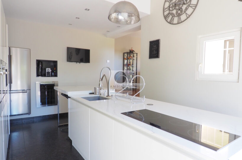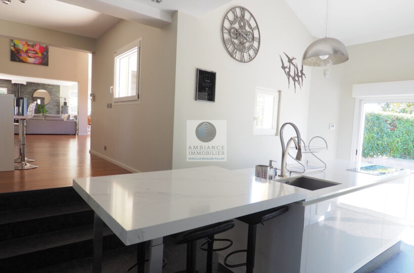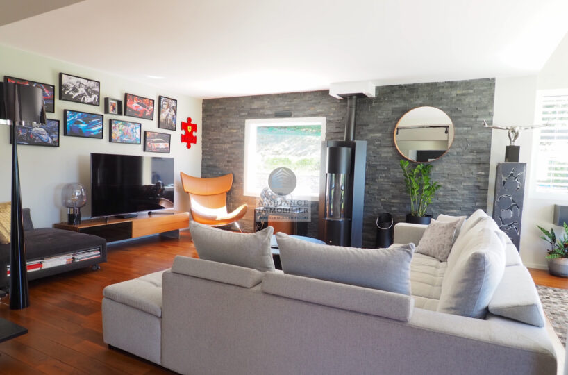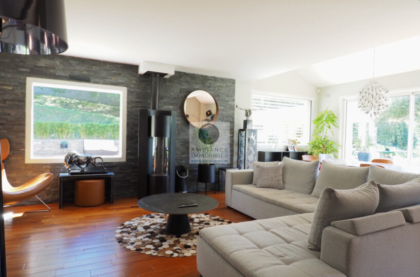 Salon-séjour de 77m2 avec un magnifique parquet et un poêle à granulés design, une grande baie à galandage offrant une belle perspective sur le parc et le paysage, une superbe cuisine totalement intégrée, buanderie, cellier.