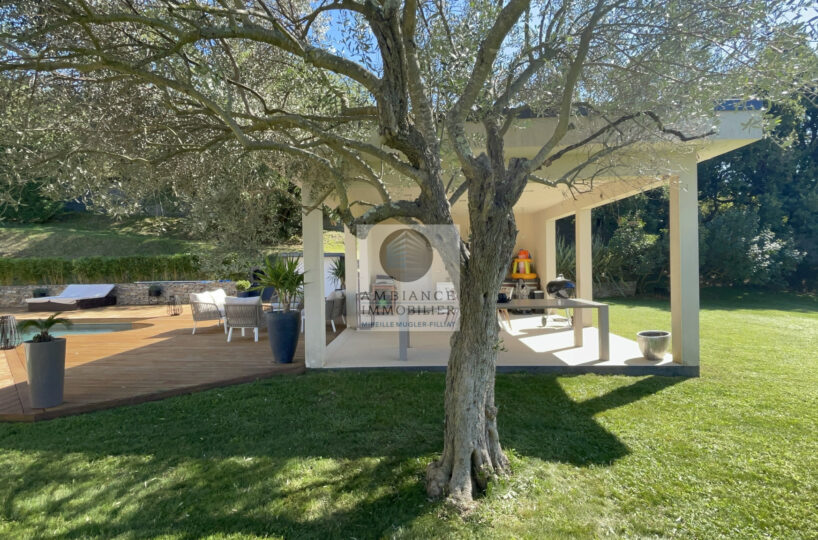 De belles ambiances de terrasses en bois et gravicolor et un pool-house de 31m2.