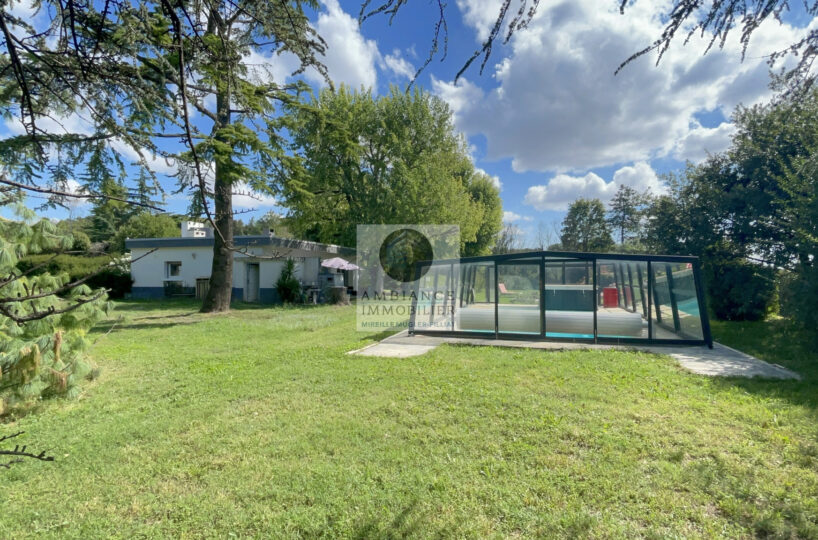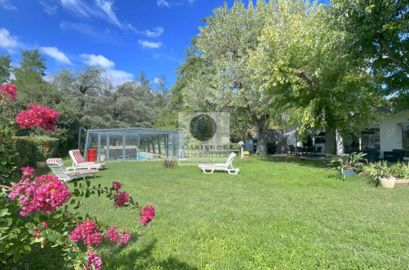 Jardin paysager avec des arbres centenaires et un espace détente autour d’une piscine avec jacuzzi de 9m x 4m sécurisée par un dôme et volet roulant. Arrosage intégré avec l’eau de la Bourne.
