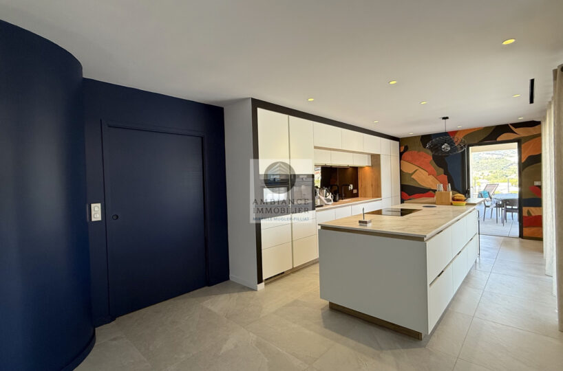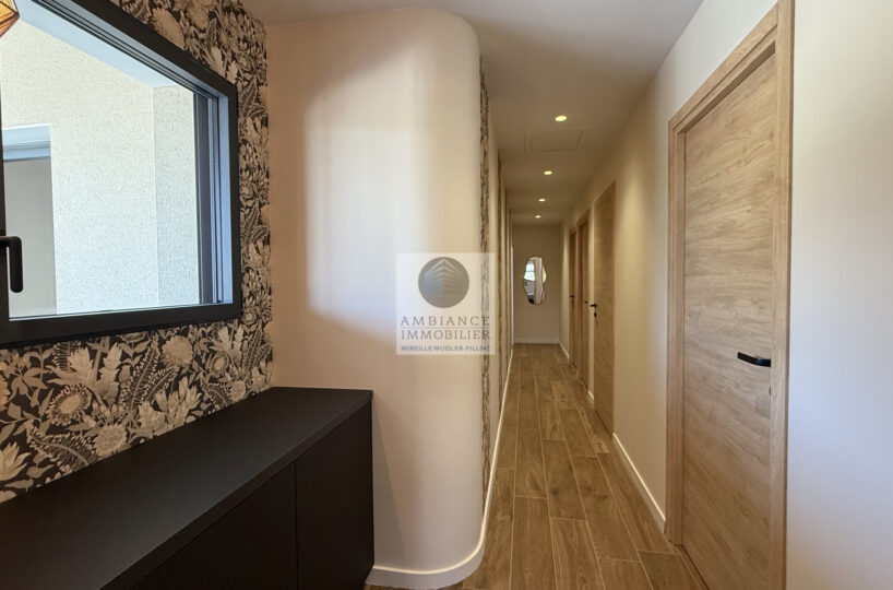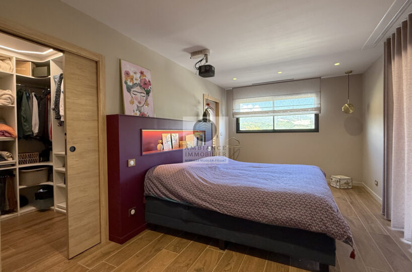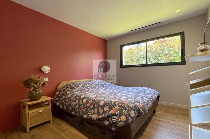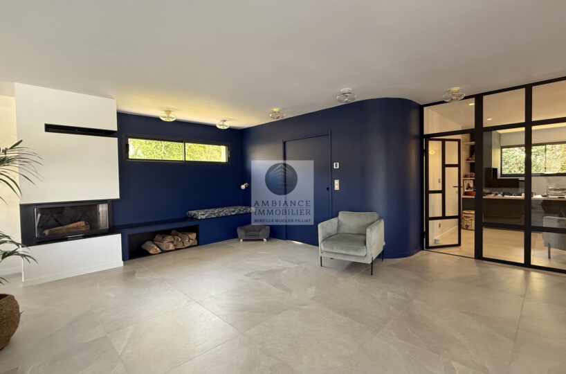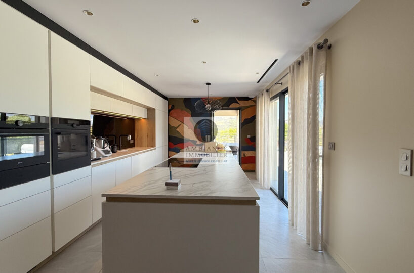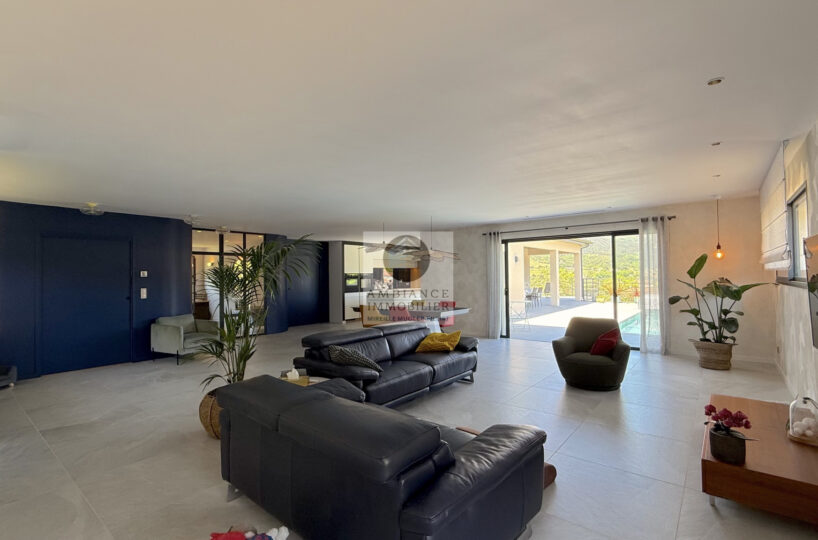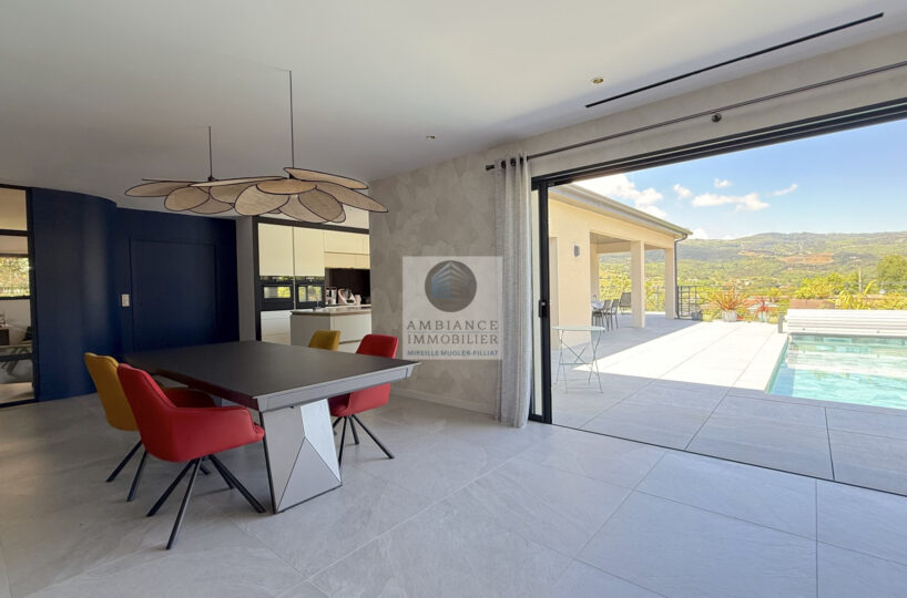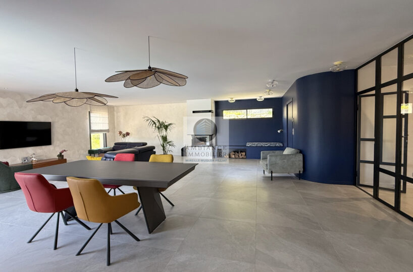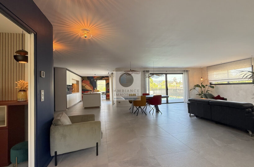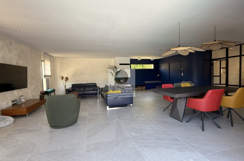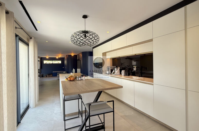 Une magnifique pièce de vie de 95m2 : Cuisine de 19m2 superbement intégrée, séjour-salon avec cheminée et une grande baie vitrée à galandage pour accéder à une vaste terrasse avec une piscine chauffée de 7m x 3m avec nage à contre-courant et sécurisée par un volet.