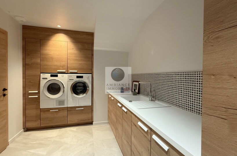 Une vaste buanderie, une salle de jeux de 40m2, une salle de sport ou home cinéma de 30m2 et un petit appartement de 46m2 avec un accès indépendant : cuisine intégrée, une pièce de vie avec un coin nuit de 31m2 et une salle d’eau.