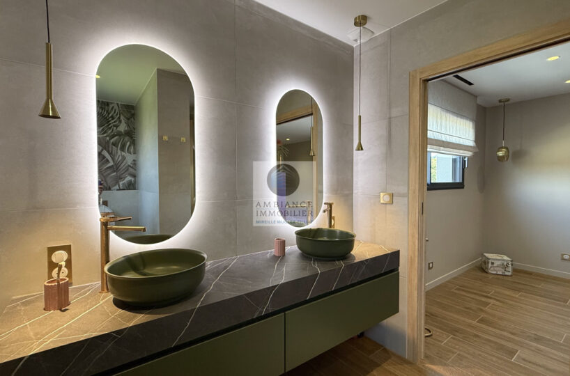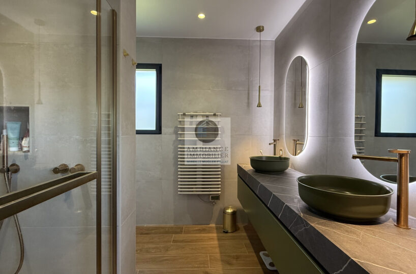 Un espace nuit : 1 salle de bains avec vasque, baignoire et douche, 3 chambres dont 1 suite parentale de 29m2 avec dressing et salle d’eau : douche à l’italienne et 2 vasques.