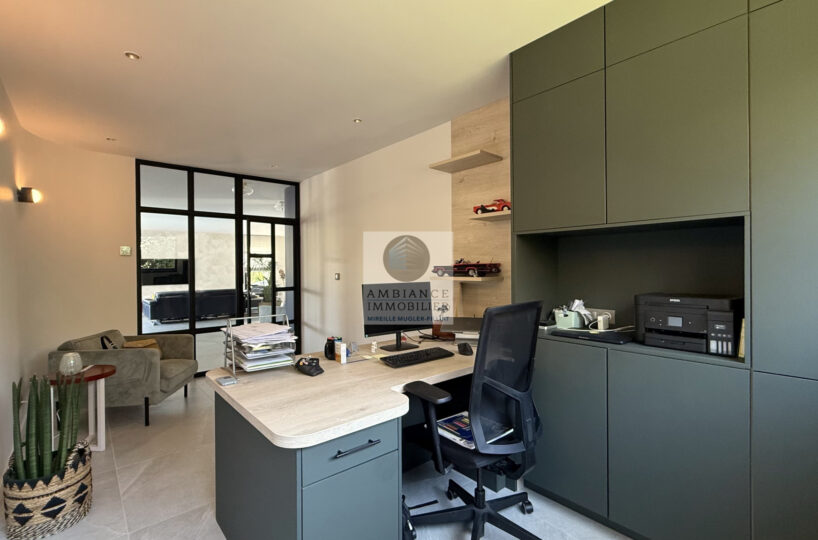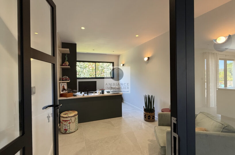 Un bureau de 15m2 avec un mur en verrière offrant une belle perspective sur le salon.