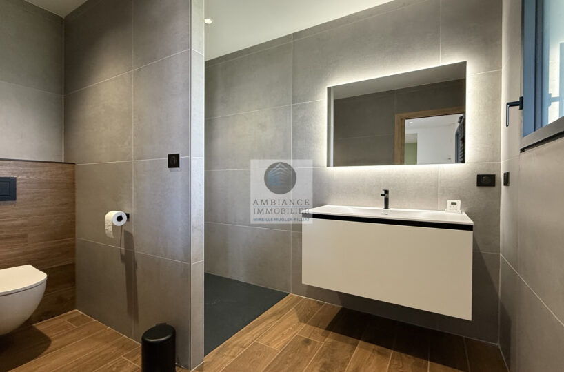 Chauffage par pompe à chaleur : plancher chauffant-rafraîchissant et gainable – panneaux photovoltaïques – huisseries en alu – domotique.