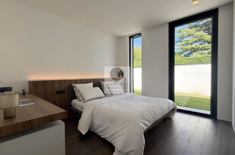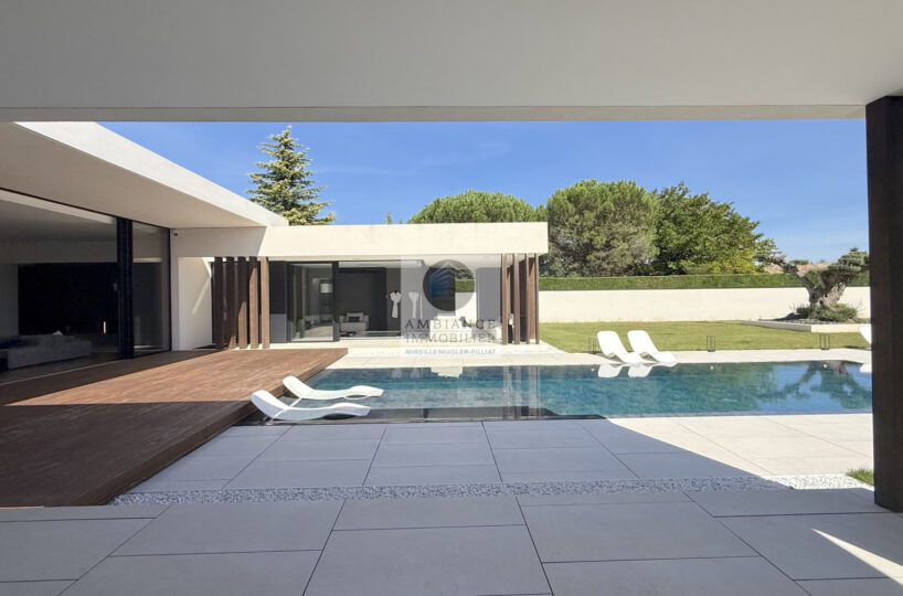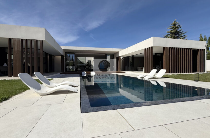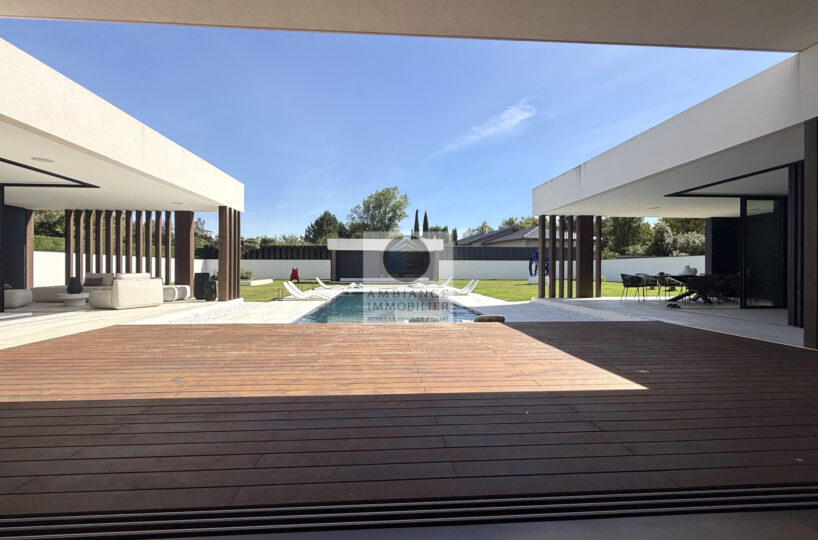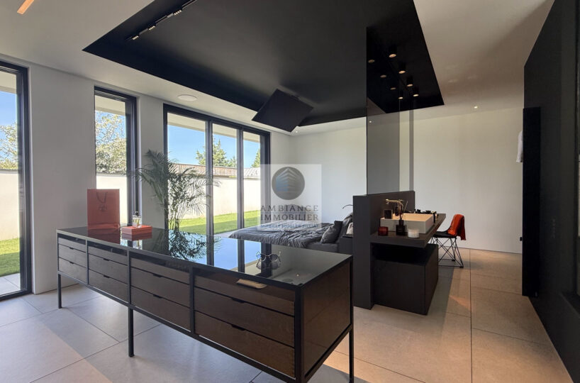 VALENCE à 10mn, un projet unique, la perfection des lignes, un jeu subtil de lumière, de perspectives, la frontière effacée entre l’intérieur et l’extérieur, l’alliance parfaite de la modernité et du confort pour cette maison d’architecte de plain-pied de 282 m2 avec un jardin joliment paysager de 2 062 m2 avec piscine miroir.