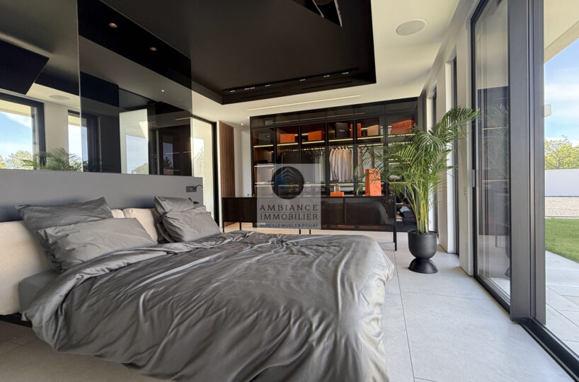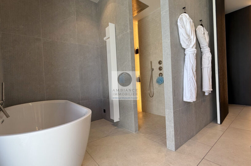 Un espace nuit avec 4 chambres dont une master suite de 43m2 avec salle d’eau : douche à l’italienne avec ciel de pluie, vasque et dressing, une ambiance très raffinée pour cette suite parentale.