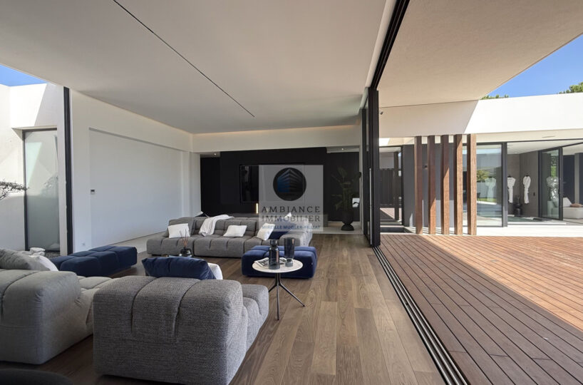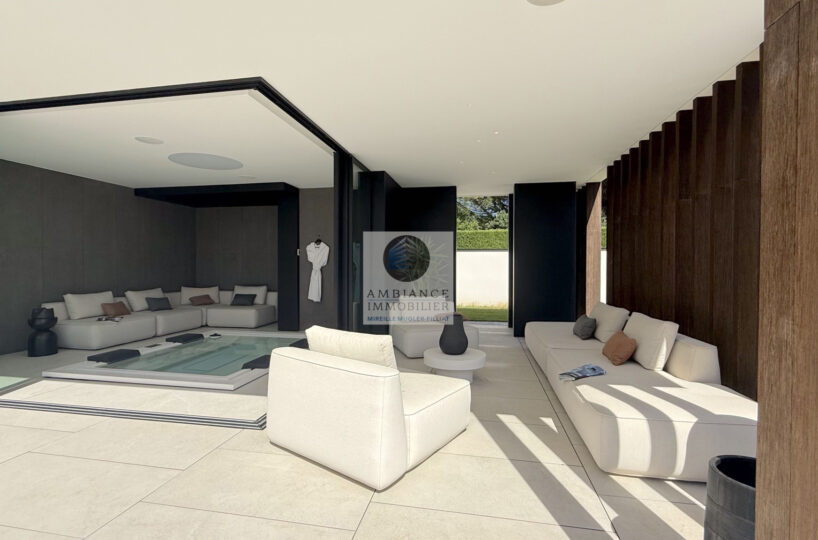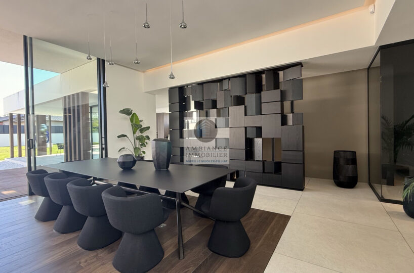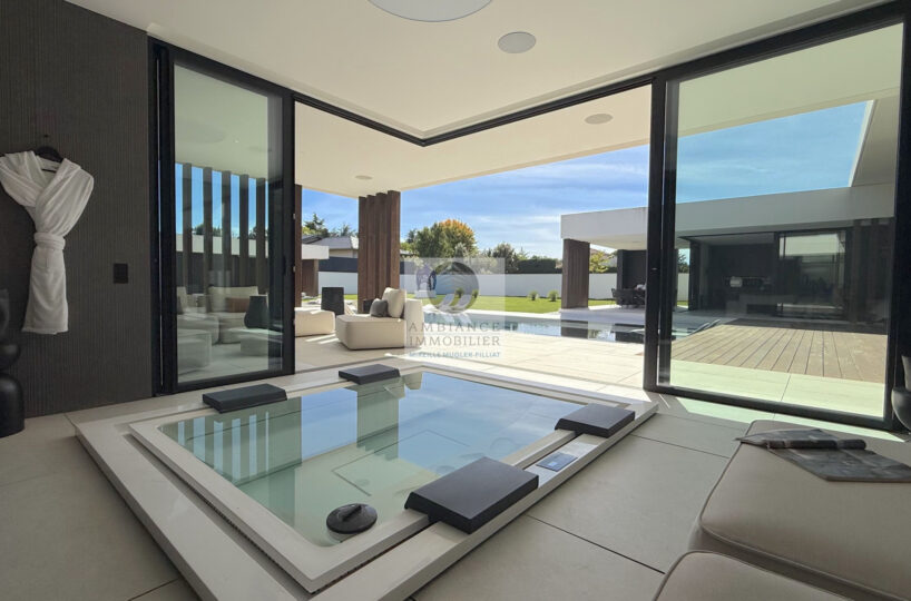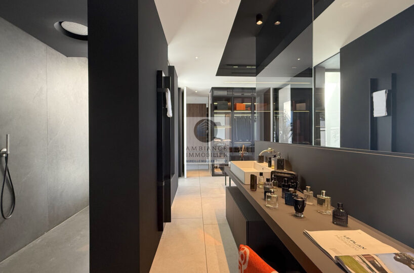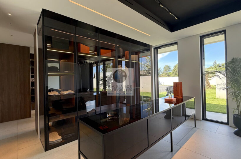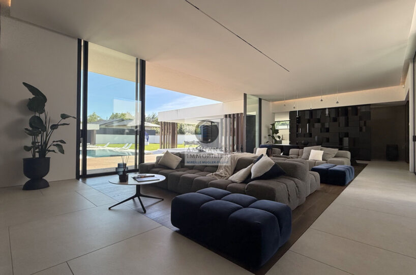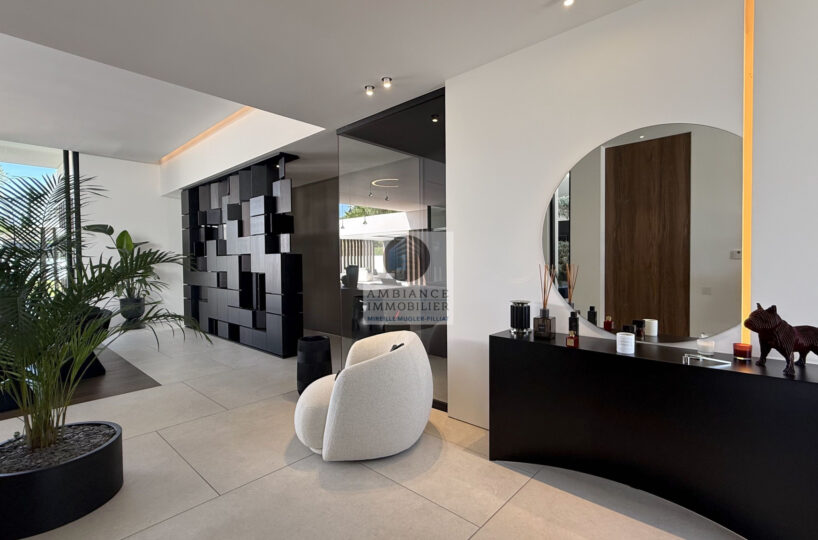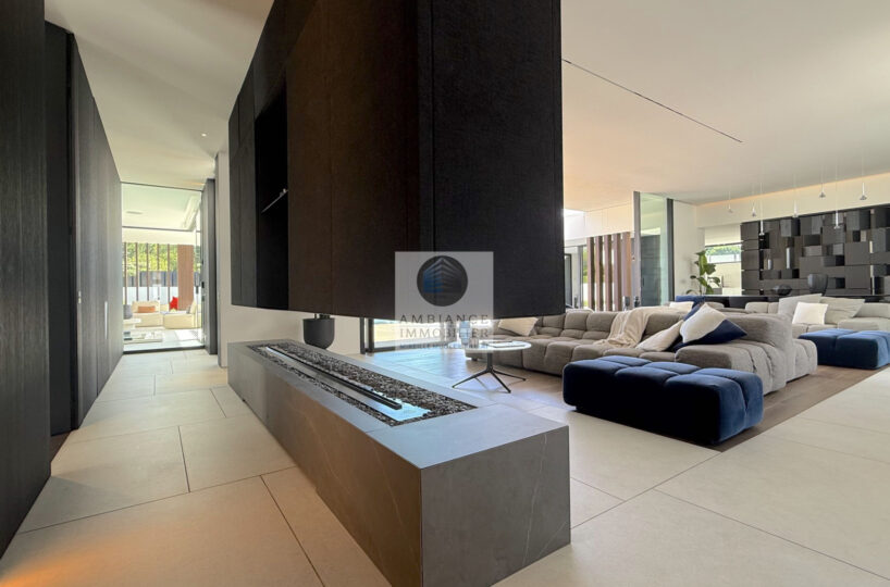 Un hall d’entrée avec la transparence d’un verre fumé sur le garage, un superbe salon-séjour de 77m2 avec cheminée à vapeur d’eau, une bibliothèque, création unique structurant l’espace, un patio végétalisé, une extension naturelle vers l’extérieur avec cette immense baie vitrée de 12m offrant une belle perspective sur la piscine et le jardin, une cuisine intégrée ‘Minimal Cucine’ de 41m2 avec accès à de magnifiques terrasses.