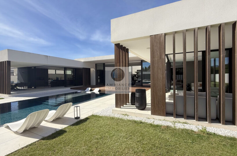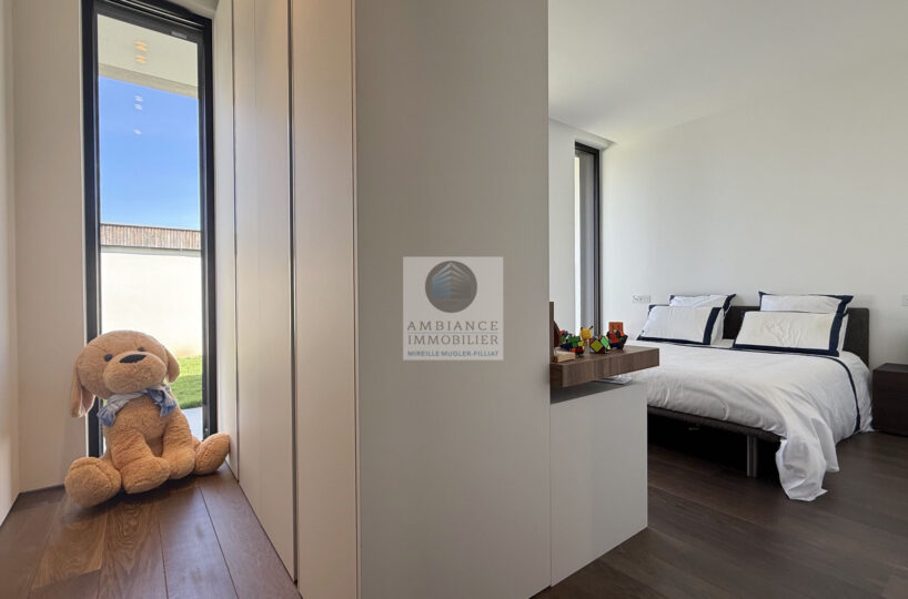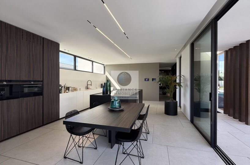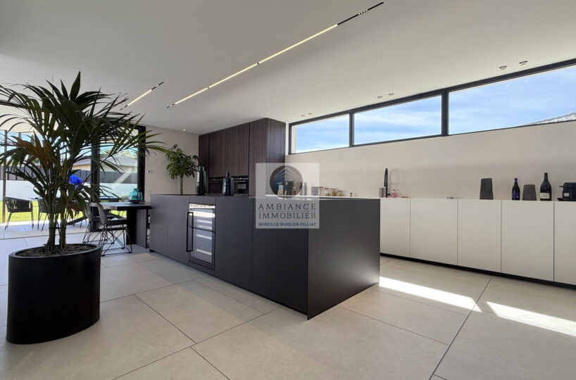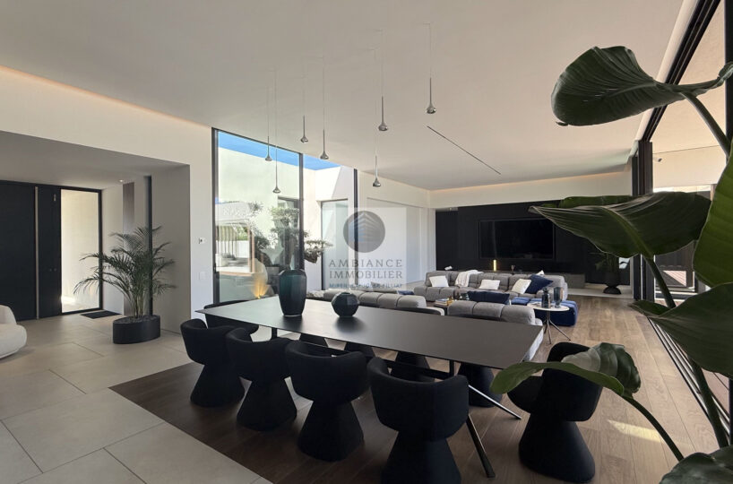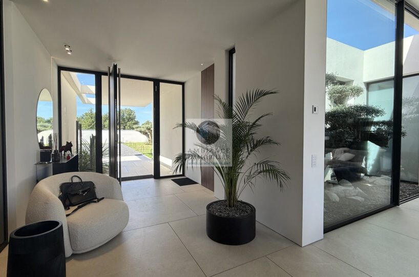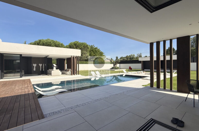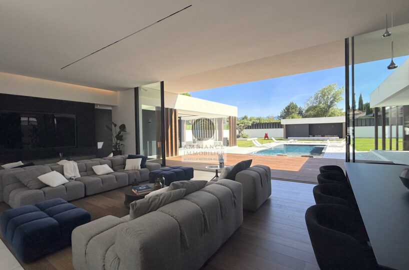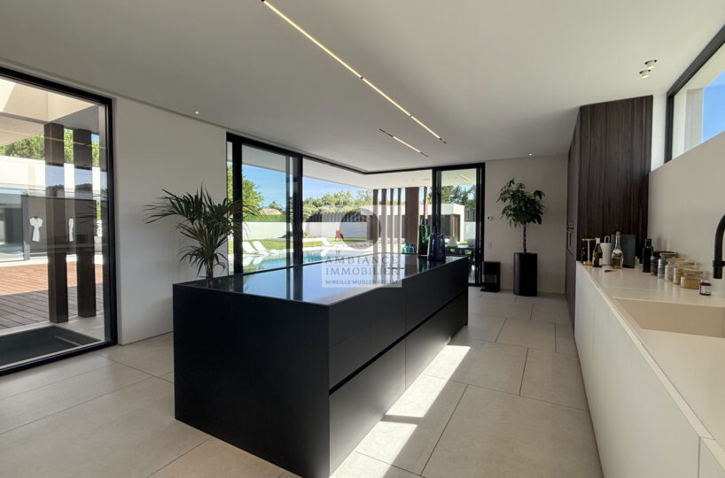 Un hall d’entrée avec la transparence d’un verre fumé sur le garage, un superbe salon-séjour de 77m2 avec cheminée à vapeur d’eau, une bibliothèque, création unique structurant l’espace, un patio végétalisé, une extension naturelle vers l’extérieur avec cette immense baie vitrée de 12m offrant une belle perspective sur la piscine et le jardin, une cuisine intégrée ‘Minimal Cucine’ de 41m2 avec accès à de magnifiques terrasses.